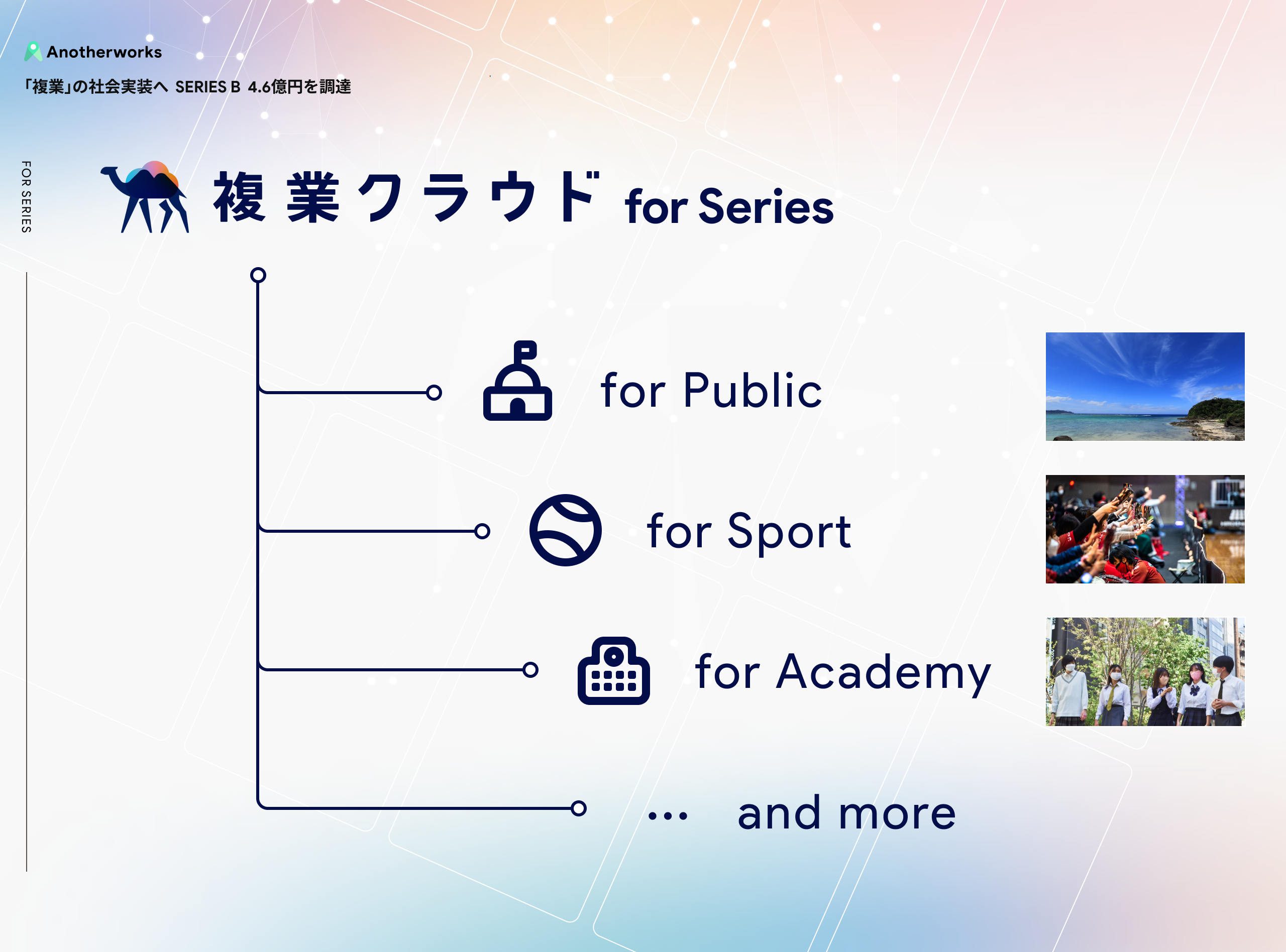民間企業では当たり前になりつつある複業人材登用を、自治体/スポーツチーム/教育機関などあらゆるステークホルダーとも連携し、支援しています。「複業クラウドfor Series」として、自治体向けには複業クラウド for Publicを、スポーツチーム向けには複業クラウド for Sportを、教育機関向けには複業クラウド for Academyを提供しています。