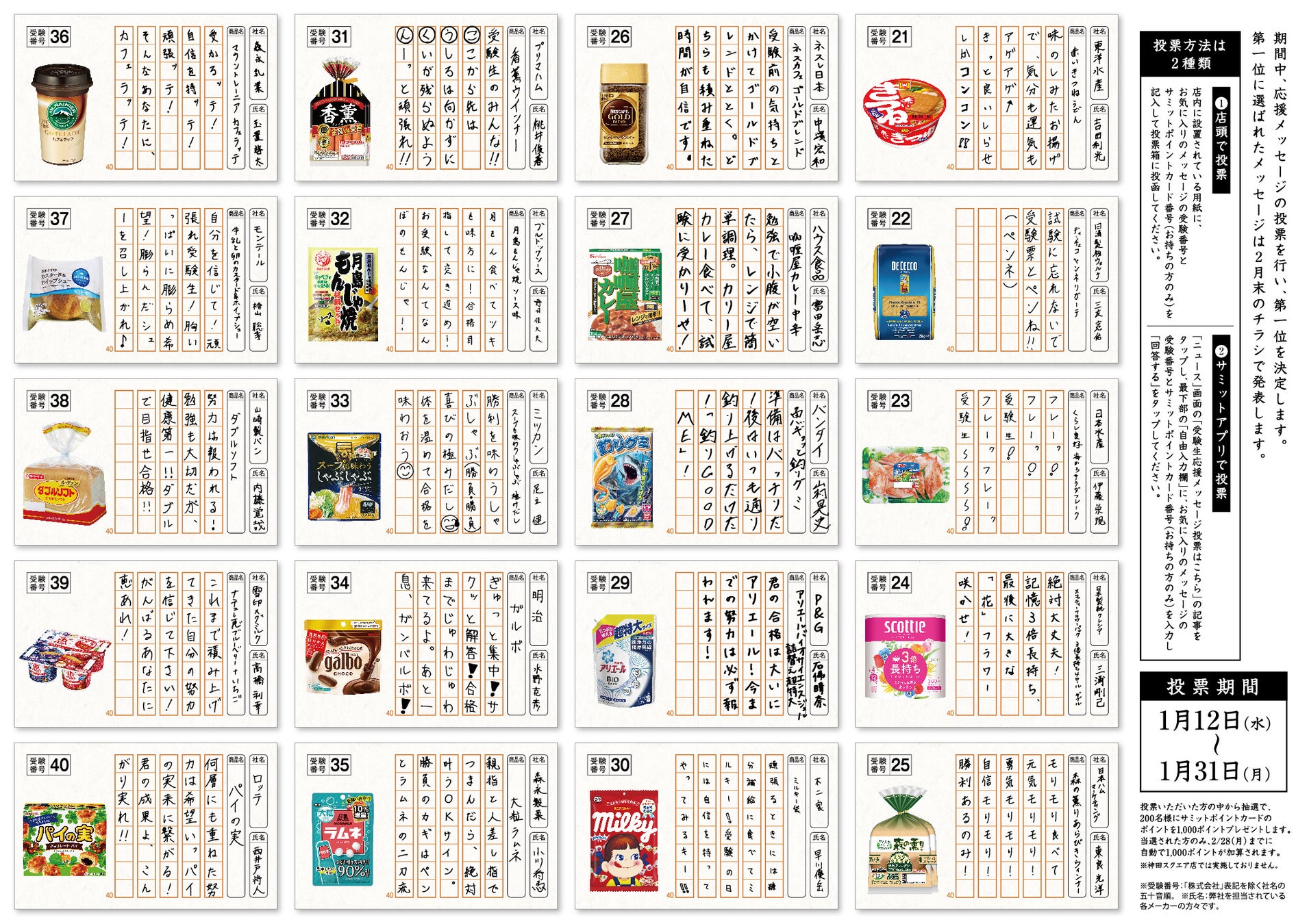 解答者は、各メーカー様でサミットと一緒にワクワクするお店づくりをご担当して頂いている方々です。「自社商品」「応援」「クスっと」をキーワードに、それぞれ趣向を凝らした40の力作をご解答いただきました。すべての解答は、1月12日(水)から店内にて配布するチラシに掲載し、1月31日(月)までの期間、応援メッセージの人気投票を行います。投票をしていただくと、サミットポイントカードをお持ちの方の中から抽選で200名様にサミットポイントカードのポイントを1,000ポイントプレゼントいたします(※)。なお、1位に選ばれたメッセージは2月末のチラシで発表する予定です。