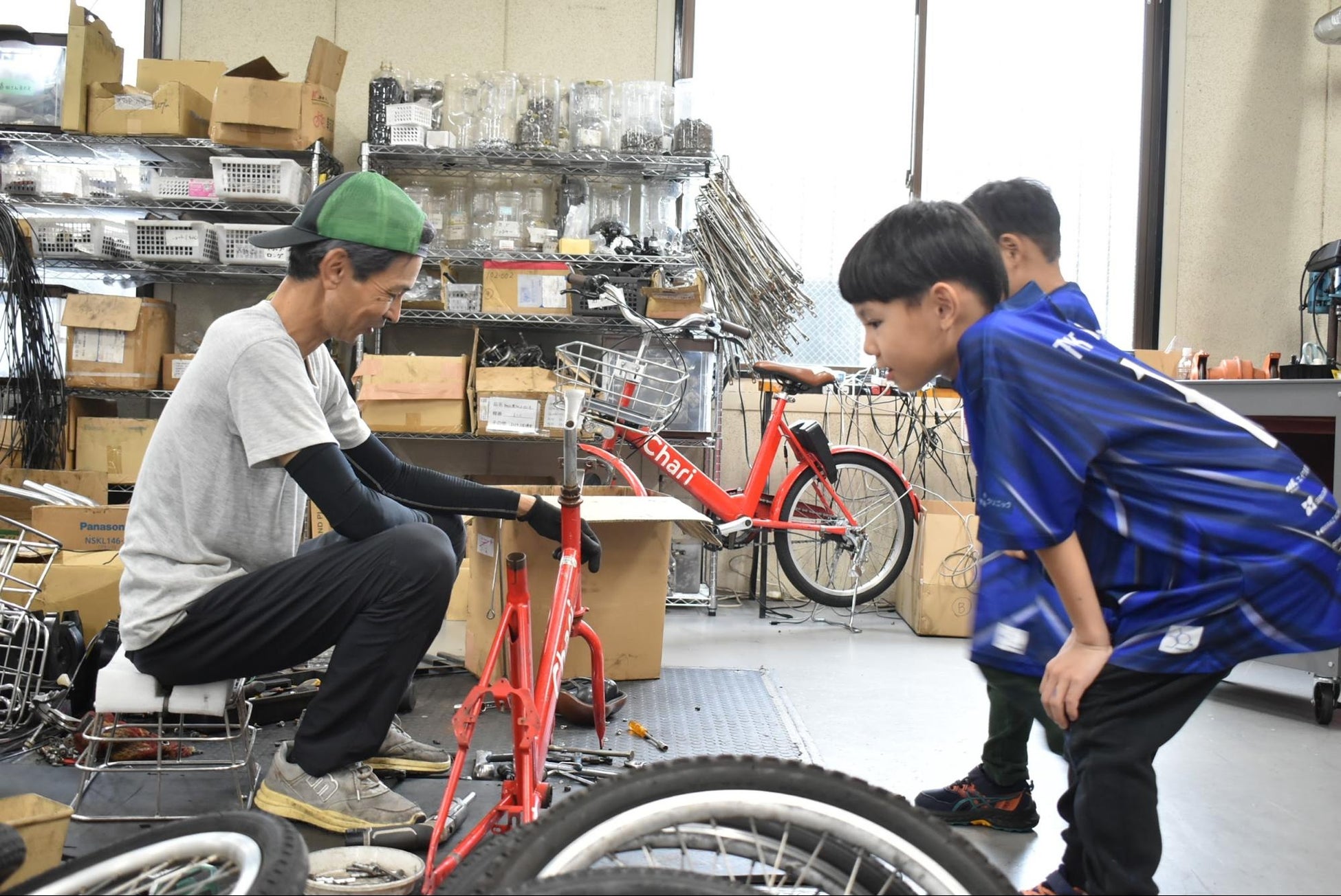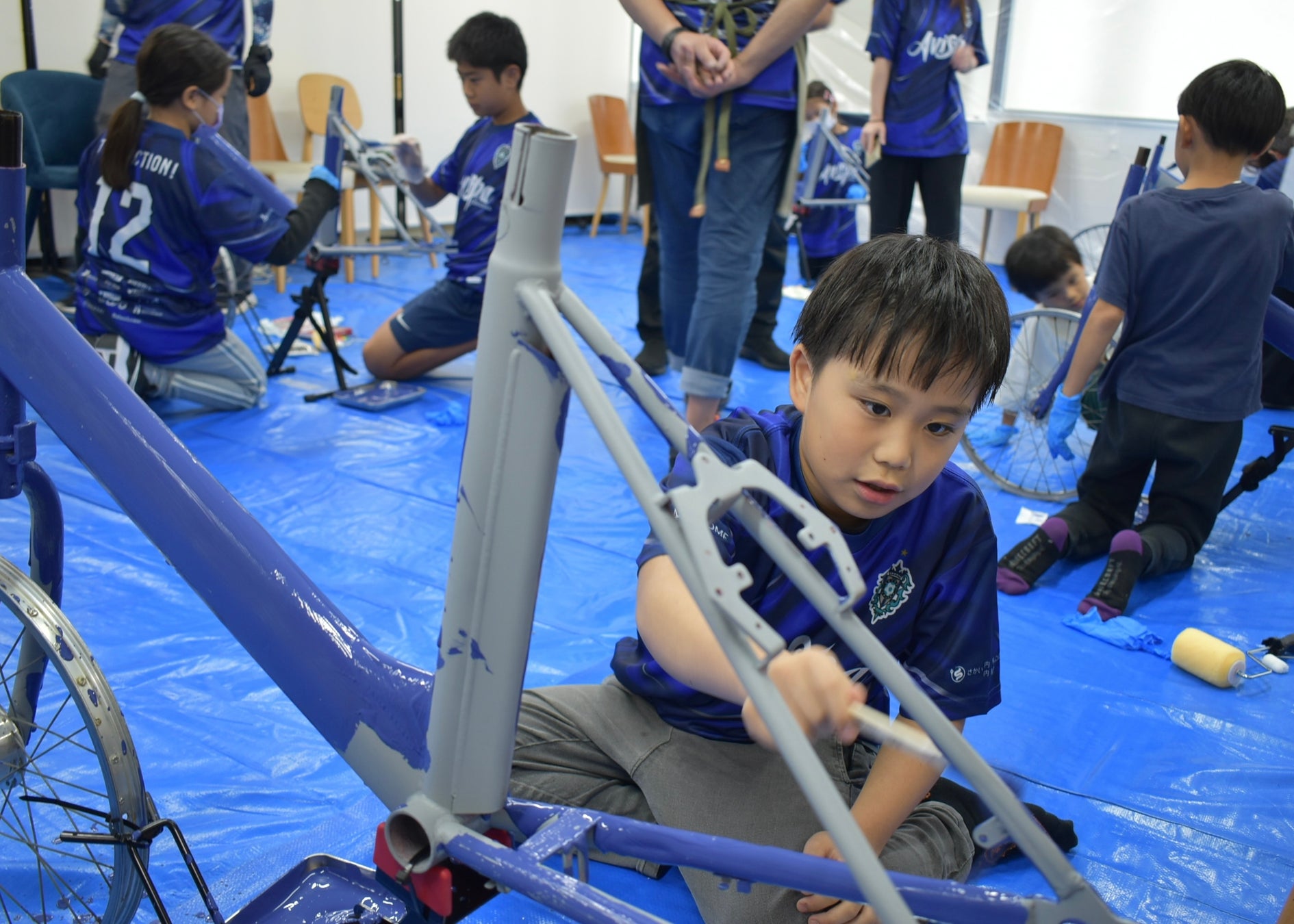 イベント当日は、アビスパ福岡の公式マスコット「スビーくん」も駆けつけ、会場を大いに盛り上げました。5組の参加者たちは、慣れない手つきながらも塗装や装飾に熱心に取り組み、世界に1つだけの「アビスパ福岡チャリチャリ」を創り上げました。また普段は見ることのできないチャリチャリの倉庫内で自転車整備の様子も見学し、子どもから大人まで楽しみながらアップサイクルについて学びました。