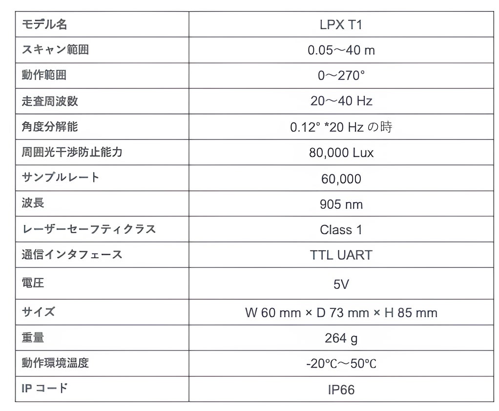 LPX-T1 / ToF方式、スキャン範囲最大40 m、270°対応2D LiDAR
