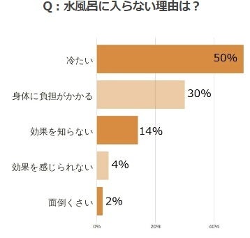 続いて多かったのが、“身体に負担がかかる”の30%。 確かにサウナ後や温泉後に水風呂といった流れは急激な温度差があるためちょっと身体的にツライな、という人もいるかもしれません。