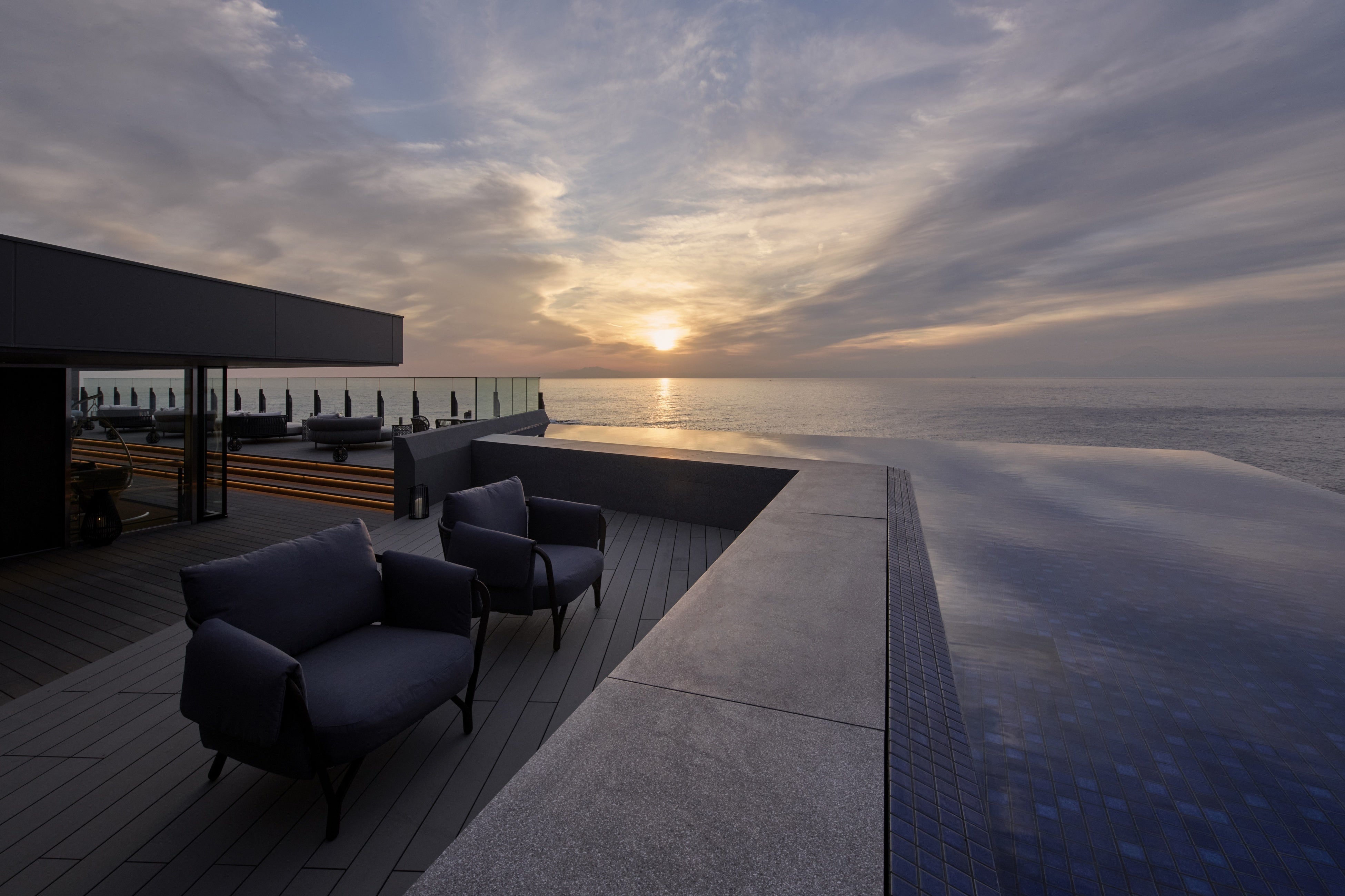 4階にしつらえたルーフトップラウンジ「宵星(よいぼし)」では、水平線が遮るものなく眼前に広がります。さらには海とインフィニティーに広がる水盤も。昼は岩礁に打ちつける波を、夕刻には富士山の隣に沈みゆく夕陽を、そして夜には灯りの揺らめきと満天の星空を眺めながら、印象的なひとときをお過ごしくださいませ。また、お時間限定で貸切利用も可能。完全プライベートな空間で、大切な方とのかけがえのないひとときをお過ごしいただけます。