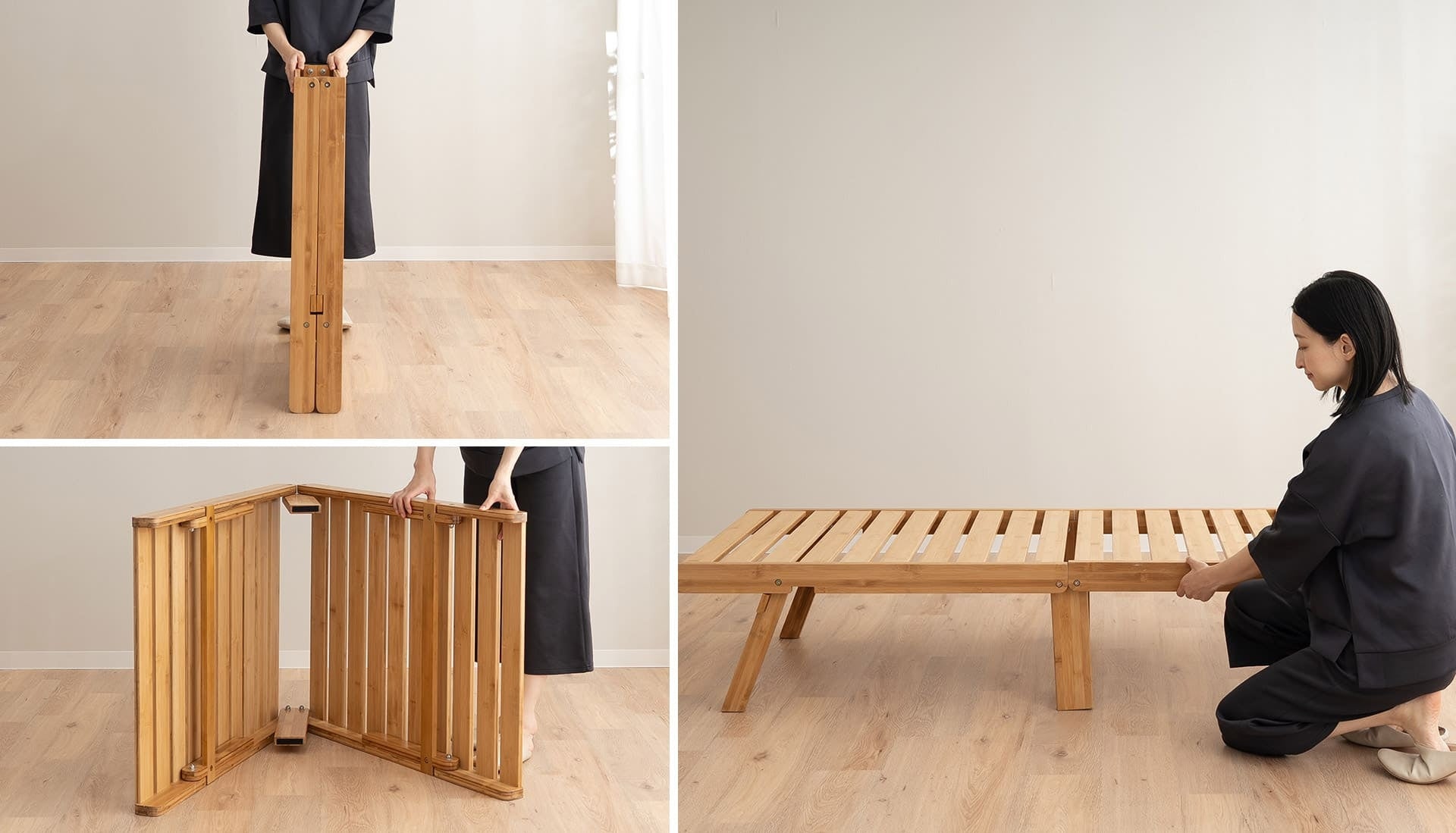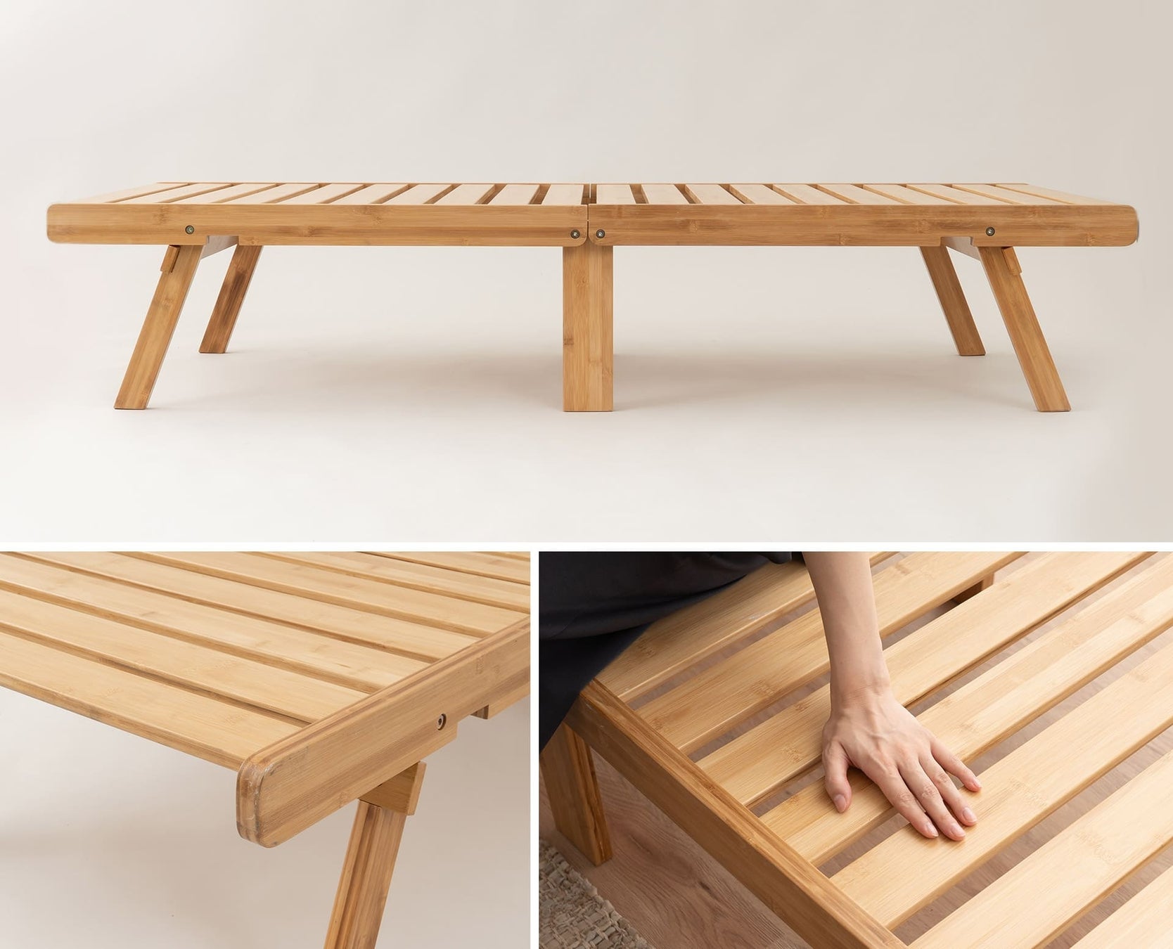 硬くて丈夫、抗菌性や調湿性にも優れた竹を使い、日本的なミニマルデザインに仕上げました。届いたその日から使える完成品で、ワンルームから海外のジャパンディ空間まで、どんな場所でも快適な眠りを叶えます。