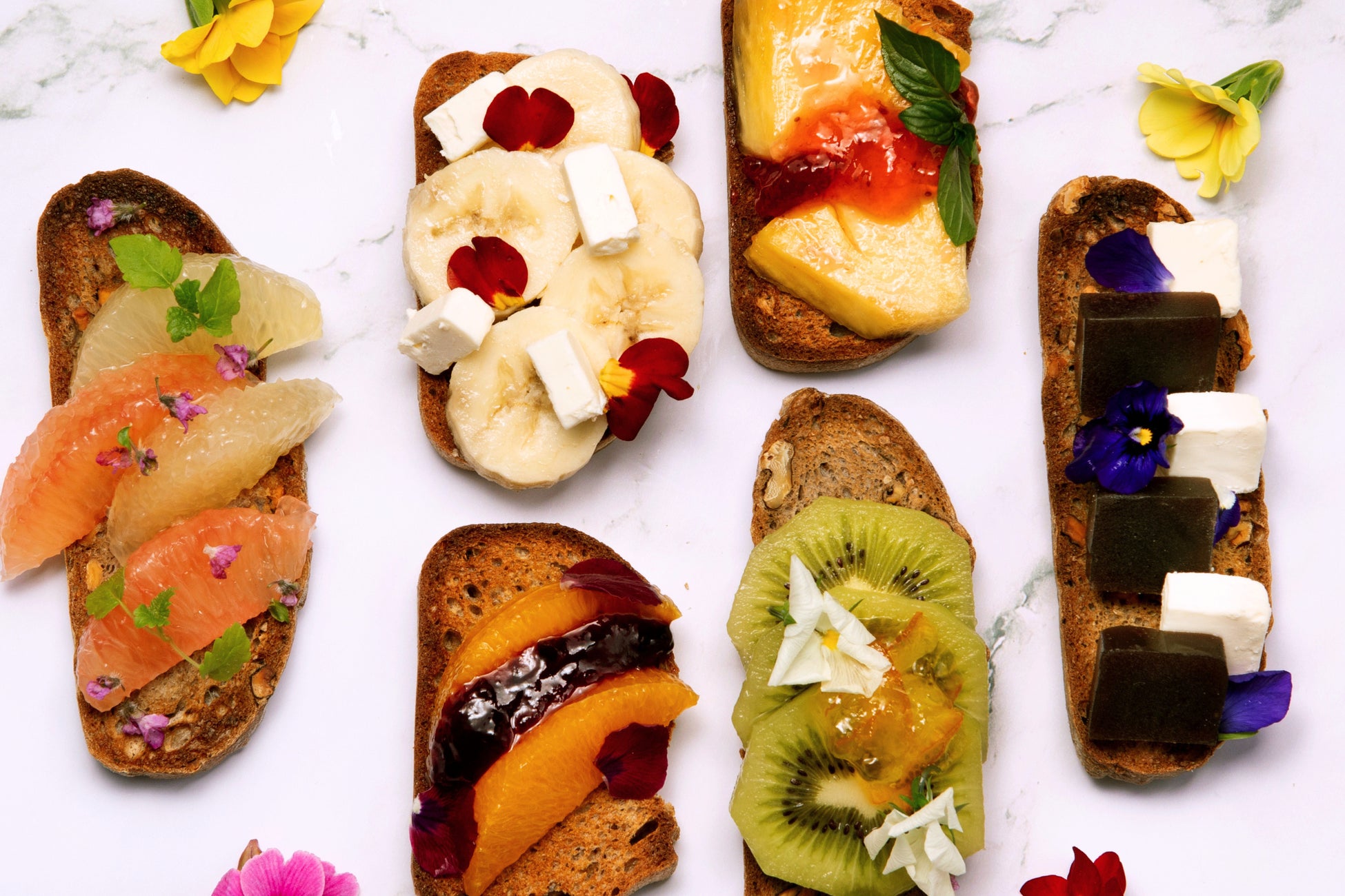 <フレッシュなフルーツやスイーツをこんがり焼いたパンに乗せるだけで、フォトジェニックな朝食スイーツができあがります>