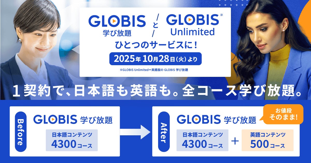 株式会社グロービスは、10月28日より定額制動画学習サービス「GLOBIS 学び放題(日本語)」と「GLOBIS Unlimited(英語)」を統合、ひとつのアプリおよびウェブサービス上での日英両言語コンテンツ利用を可能にします。