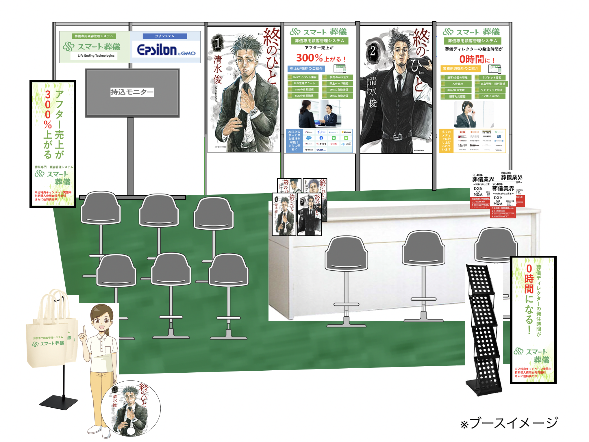 会場では、当社が開発・提供する「スマート葬儀」の機能を体験いただき、導入効果やアフターセールス売上300%増の事例をご紹介いたします。