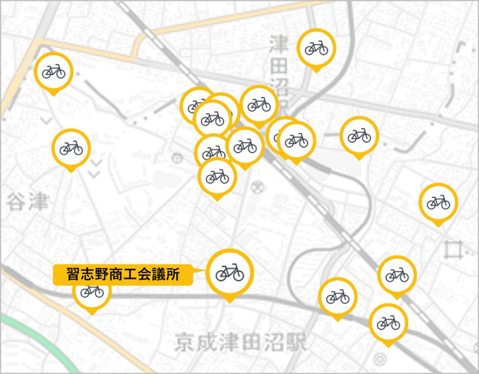 今回のステーション設置場所は、JR津田沼駅や京成津田沼駅から徒歩約10分に位置しています。これらの駅周辺(半径300m)には、すでに14か所のステーションが存在するため、交通の結節点として魅力的な立地です。商工会議所会員の駅から商工会議所への移動だけでなく、商工会議所近隣にお住まいの方の、駅への移動手段としてもご利用いただくことができ、地域住民の交通利便性の向上に寄与します。また、近隣の千葉市・船橋市内には、既に複数の「HELLO CYCLING」ステーションが設置されており、それらのステーションと連動した都市交通機能の強化も期待されます。