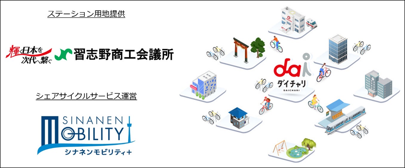 エネルギー・住まい・暮らしの総合サービス事業を展開するシナネンホールディングス株式会社(本社:東京都品川区、代表取締役社長CEO:中込 太郎)の子会社で、移動を楽しく、快適にするシェアサイクル「ダイチャリ」を運営するシナネンモビリティPLUS株式会社(本社:東京都品川区、代表取締役社長:菅原 健)は、習志野市内を中心に商工業者を支援する習志野商工会議所(本所:千葉県習志野市、会頭:芦澤 直太郎)の敷地内に、シェアサイクル「ダイチャリ」を設置し、1月15日(水)より運営を開始したことをお知らせいたします。