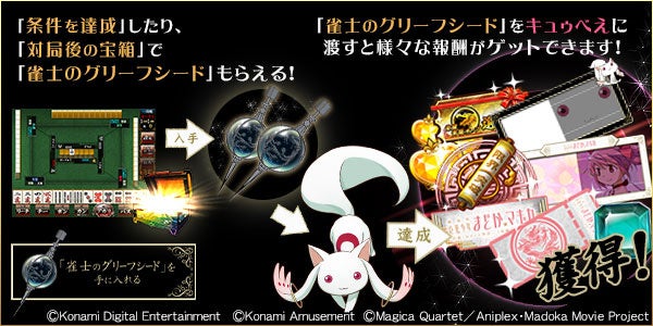 様々なミッションの達成や対局で「雀士のグリーフシード」を獲得できます。「雀士のグリーフシード」をキュゥべえに渡すとプレーヤーパネル「魔法少女まどか☆マギカ」や、「限界突破の書(魔法少女まどか☆マギカ)」などの報酬を得る事ができます。