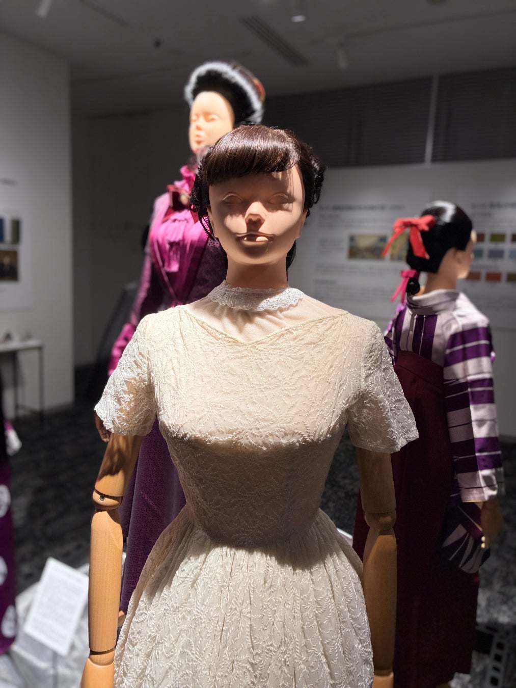 ②写真映えする鹿鳴館風ドレス、昭和20年代のワンピースを展示