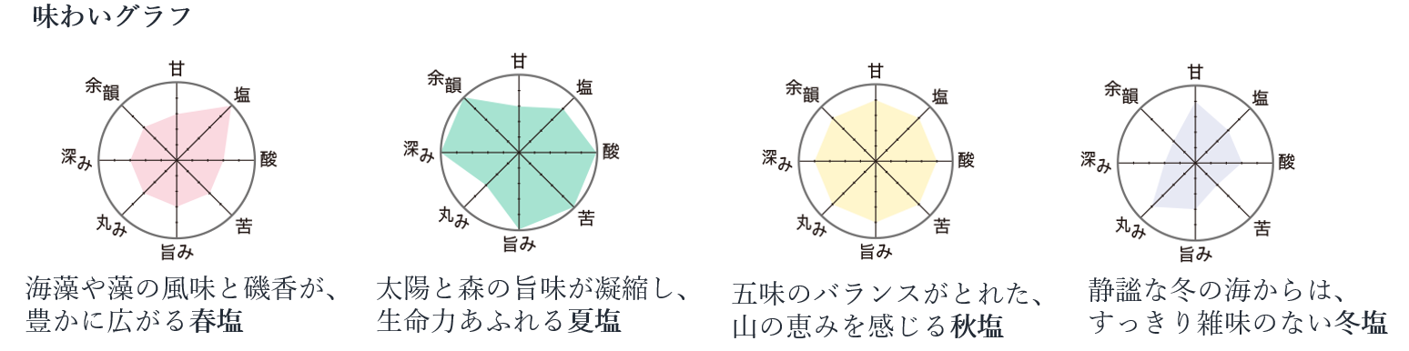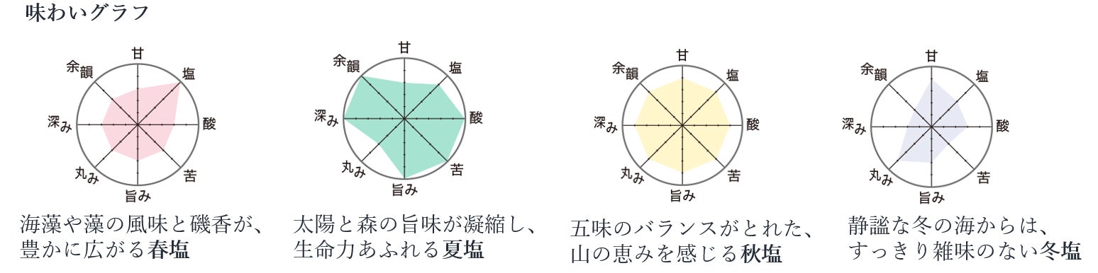- 「za you zen 四季の塩」は、豊かな森と海のミネラルが生み出す、春夏秋冬、それぞれの個性を持つ塩