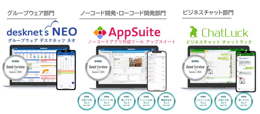 株式会社ネオジャパン(本社:神奈川県横浜市、代表取締役社長:齋藤 晶議)はスマートキャンプ株式会社(以下「スマートキャンプ」)が今最も評価されているSaaSを表彰する「BOXIL SaaS AWARD Summer 2025」において、グループウェア『desknet's NEO』、ノーコードアプリ作成ツール『AppSuite』ビジネスチャット『ChatLuck』が、3部門で計11の賞を受賞したことをお知らせします。