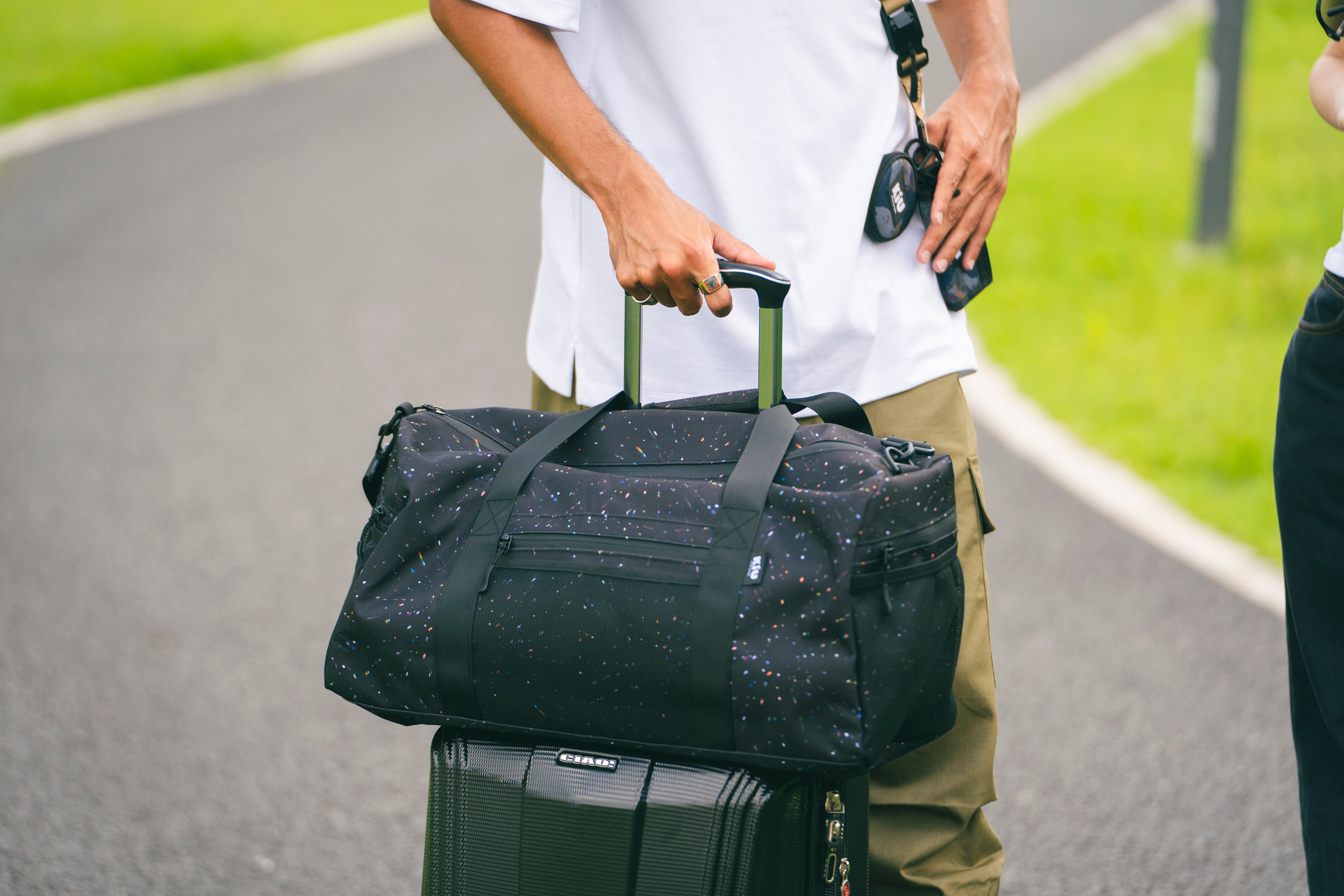 肩から斜め掛けにして持ち運ぶことで、いつでも簡単に日傘を取り出すことができます。