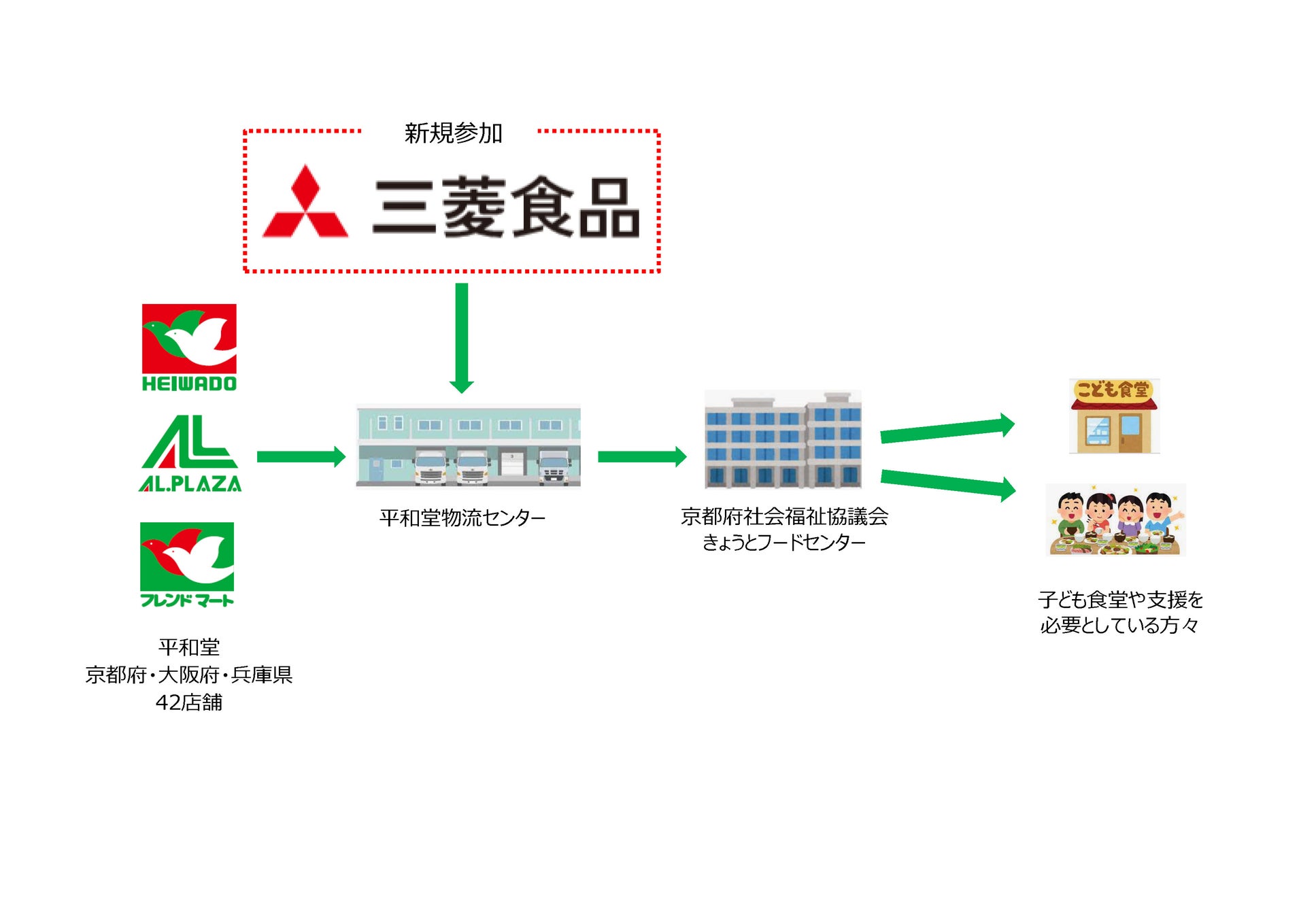 京都府社会福祉協議会が業務委託する「きょうとフードセンター」を通じて、京都府内各地域の子ども食堂の運営や、食材を必要としておられる方々のためにご活用いただきます。なお、取り組みにあたり、平和堂様と京都府社会福祉協議会、当社は、「商品寄贈に関する覚書」を締結し、2024年9月18日(水)と2025年2月20日(木)に寄付を実施しました。今後は年2回(8月・2月)の定期的な寄付を予定しています。