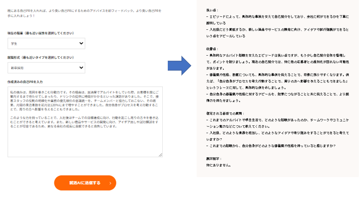 「就活AI」は、入力されたキーワードやエピソードに応じて、AIが自己PRのたたき台を作成。また、自己PRや志望動機の添削、フィードバックを実施してくれます。24時間365日無料で利用できることで、就活生や転職者が使いたいとき、すぐに使えることが特徴です。面接練習AIや自己分析サービスとも連携しており、AIを活用して就職・転職活動の“タイパ”をぐっと高めることが可能です。