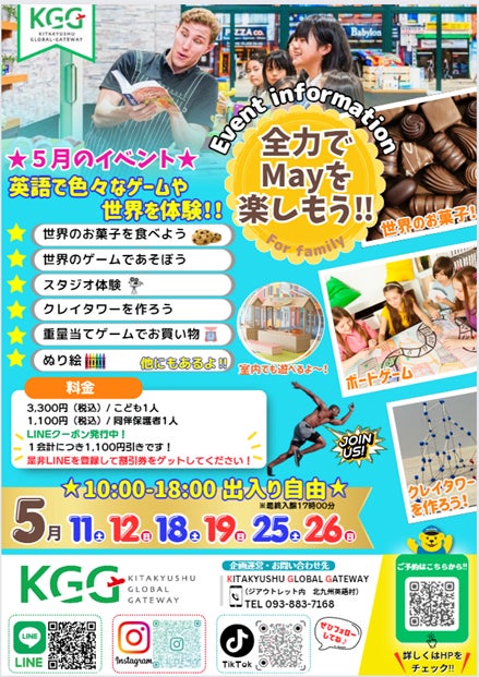 開館記念イベント後の「5月週末イベント」では、外国人スタッフと一緒に世界のお菓子を食べたり世界のゲームで遊んだりできる「全力でMayを楽しもう!!」イベントを準備しております。詳細はぜひ、ホームページまたは予約サイトでご確認ください。