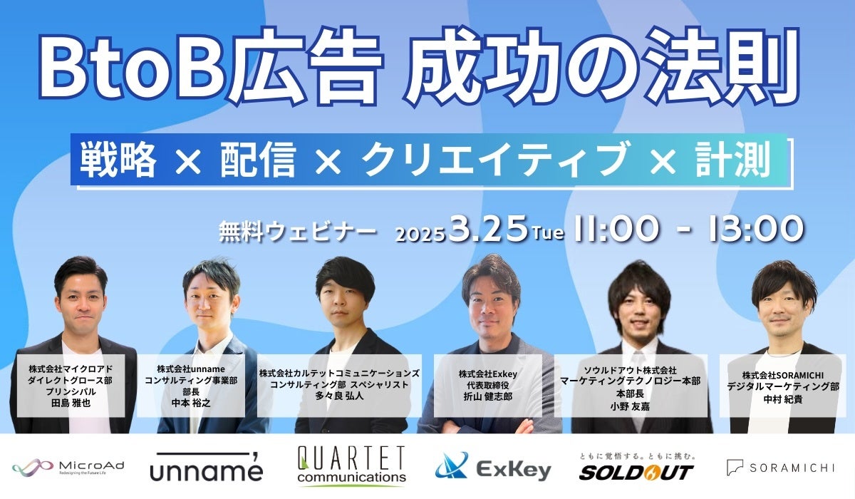 株式会社unname、株式会社カルテットコミュニケーションズ、株式会社Exkey、ソウルドアウト株式会社、株式会社SORAMICHIをお招きし、媒体選定から運用改善まで、BtoB広告の各プロセスで成果を上げるための実践的なノウハウをご紹介いたします。
