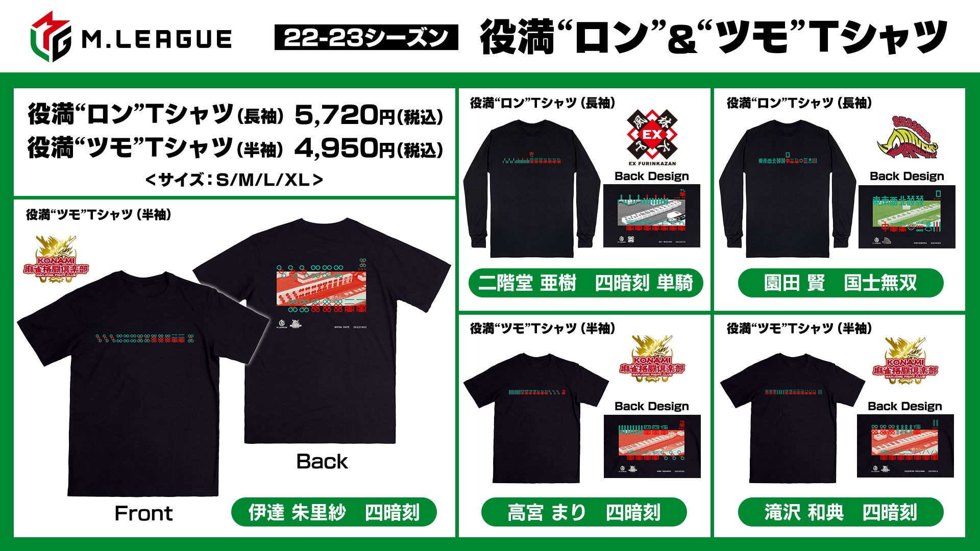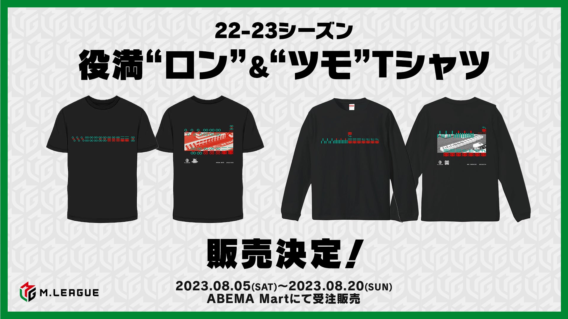 このたび、ABEMA公式オンラインストア「ABEMA Mart」では、「Mリーグ2023-24」の開幕に先駆け、前シーズンの「Mリーグ 2022-23」に出た全5試合の役満をTシャツにして販売いたします。"ツモ"は半袖、"ロン"はロングスリーブで展開。黒を基調としたシックなデザインで表には、和了した際のイラスト手牌、裏面には「ABEMA」での映像をもとにしたデザインが施されております。