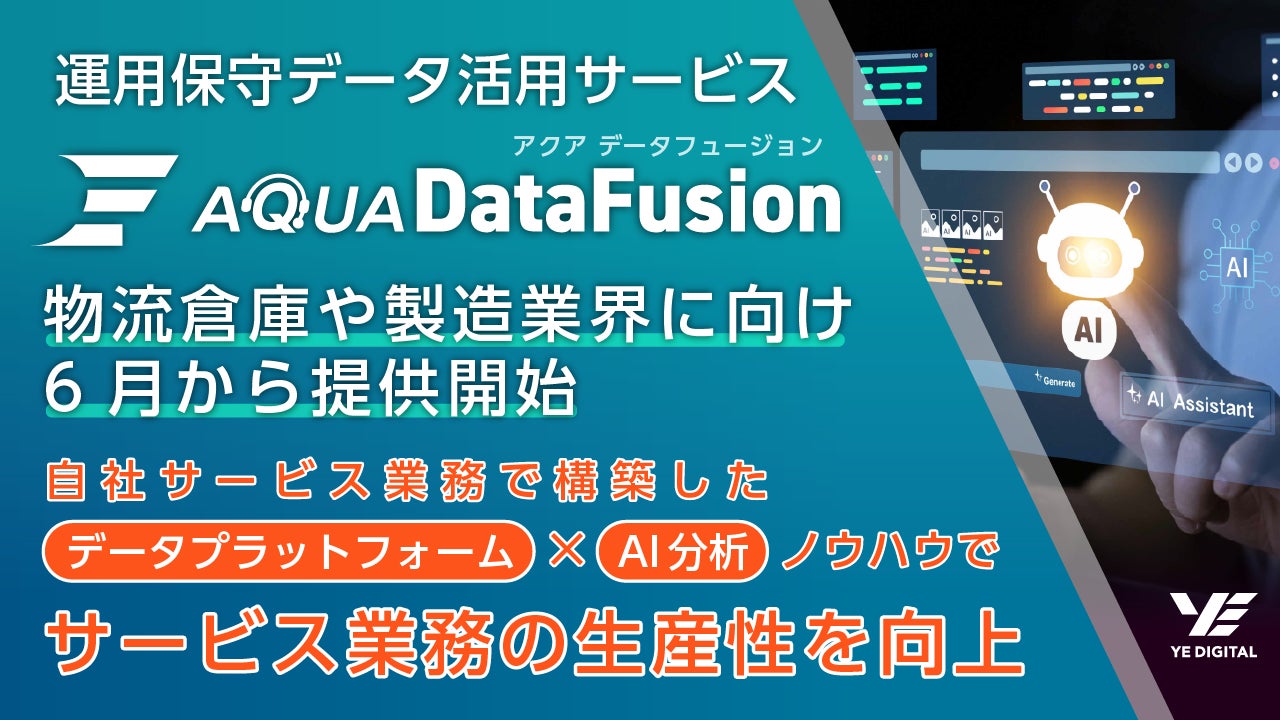株式会社YE DIGITAL(本社:北九州市小倉北区 代表取締役社長:玉井裕治、以下 YEデジタル)は2025年6月に新たに運用保守データ活用サービス「AQUA DataFusion」の提供を開始します。YEデジタルが運営するITカスタマサービスセンター「Smart Service AQUA」で構築した運用管理データプラットフォームとAI分析ノウハウを活用し、物流倉庫や製造業界のお客様に対してサービスを提供することで、業務の生産性向上や新たな価値創出を支援します。