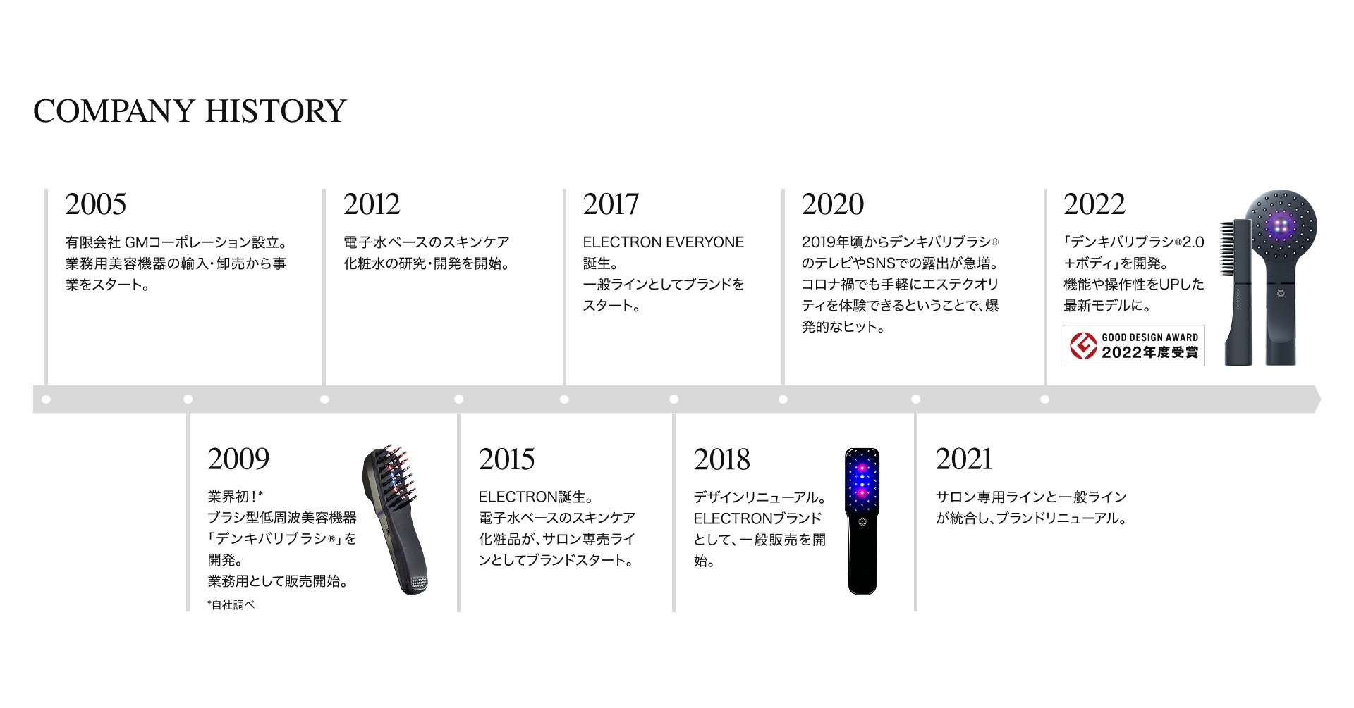『 ELECTRON(エレクトロン)』ブランドで、ブラシ型の低周波モバイル美容機器『デンキバリブラシ®』、活性電子水™(整肌成分)をベースに、独自の加工を施した新感覚のスキンケア製品を展開。