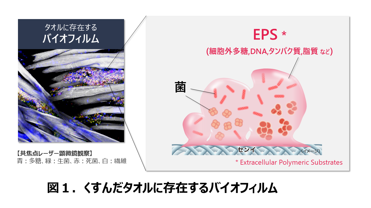 花王は、くすんだタオルにバイオフィルム(菌が分泌した多糖やタンパク質を含む菌体外マトリクス〈Extracellular Polymeric Substances:以下 EPS〉と菌の複合体)が存在することを明らかにしています(図1)※1。