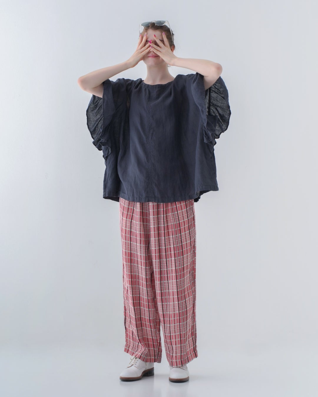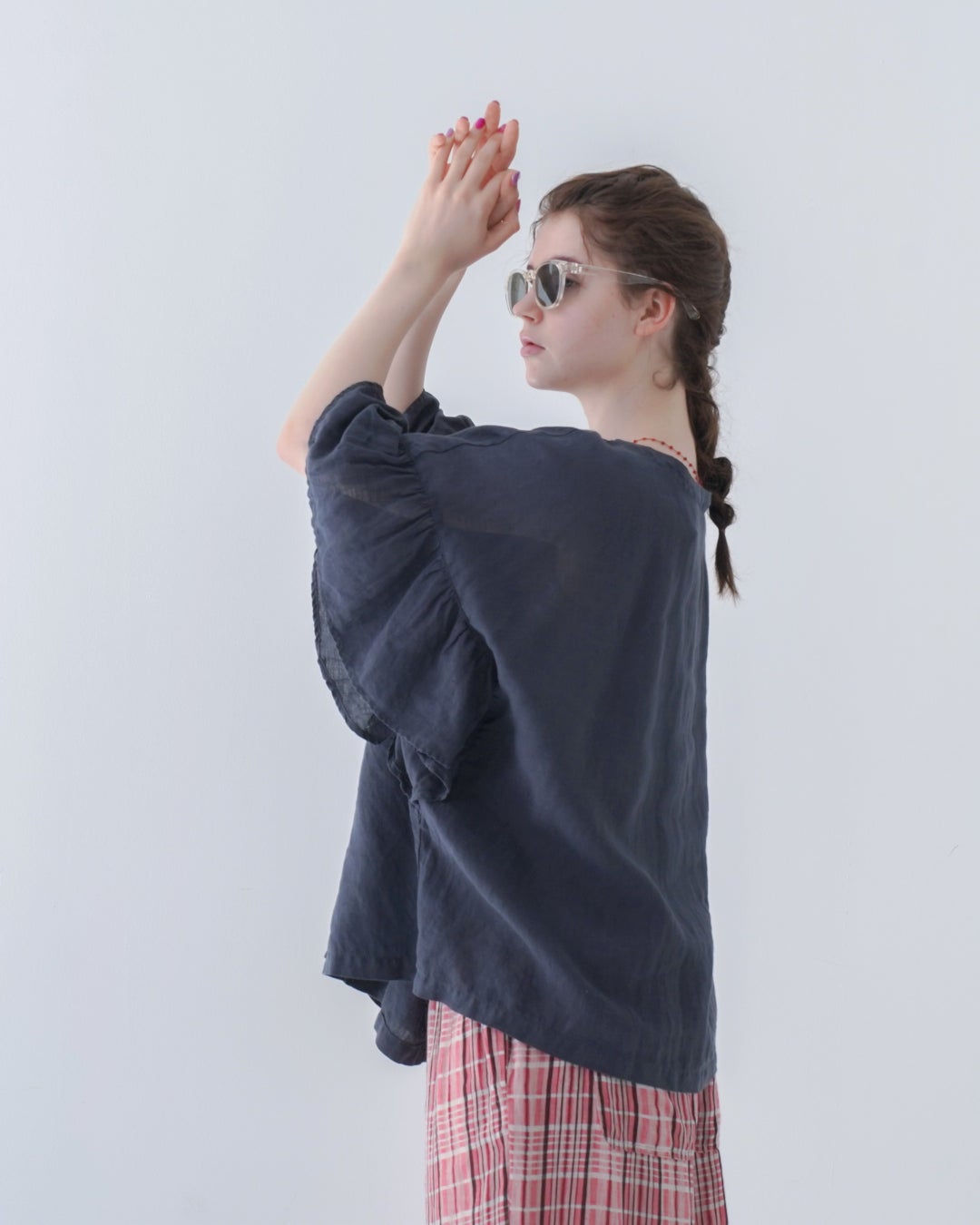 やや透け感のある涼やかな薄手のリネンを使用。袖口にあしらったラッフルが大人の女性らしさを引き立てる1枚です。