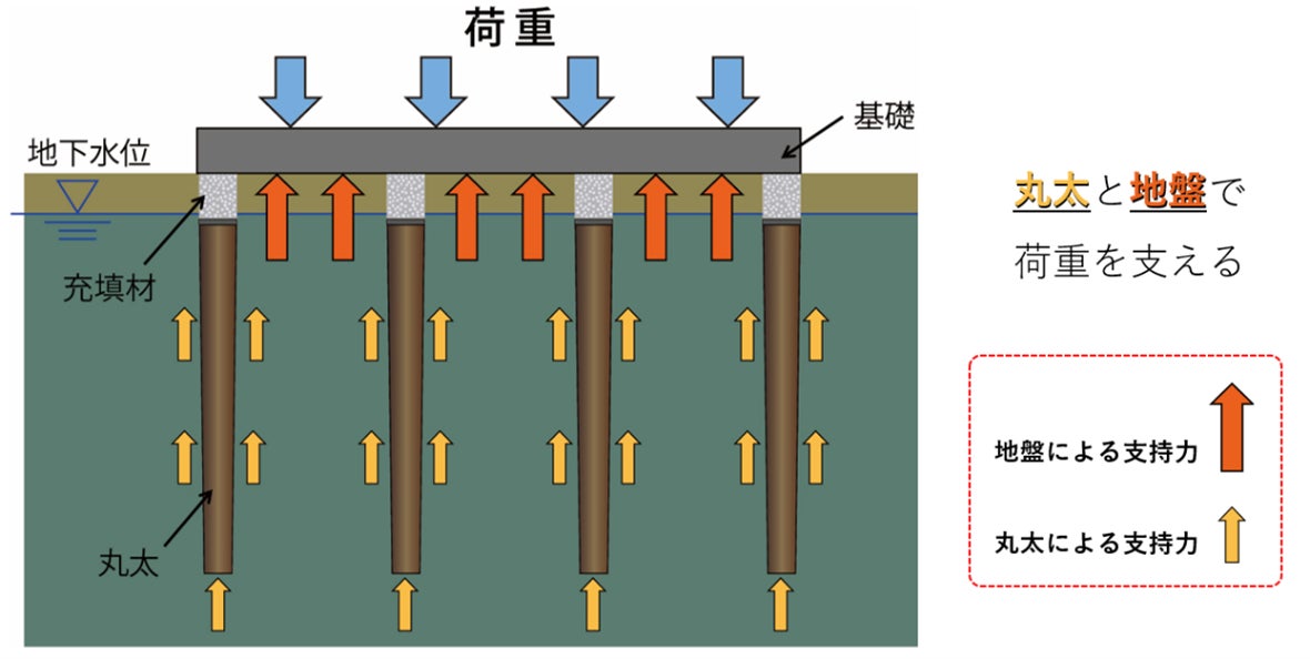 本工法は軟弱地盤に丸太を圧入し地盤と丸太の双方で構造物を支える工法です(LP-SoC工法)。丸太は頭部を地下水位より深く設置し、腐朽や蟻害による生物劣化を防ぎます。圧入した丸太頭部を特殊な粘土で覆い地下水位の増減による影響を回避し、丸太頭部から基礎までを充填材(砕石)で締固め埋め戻します。