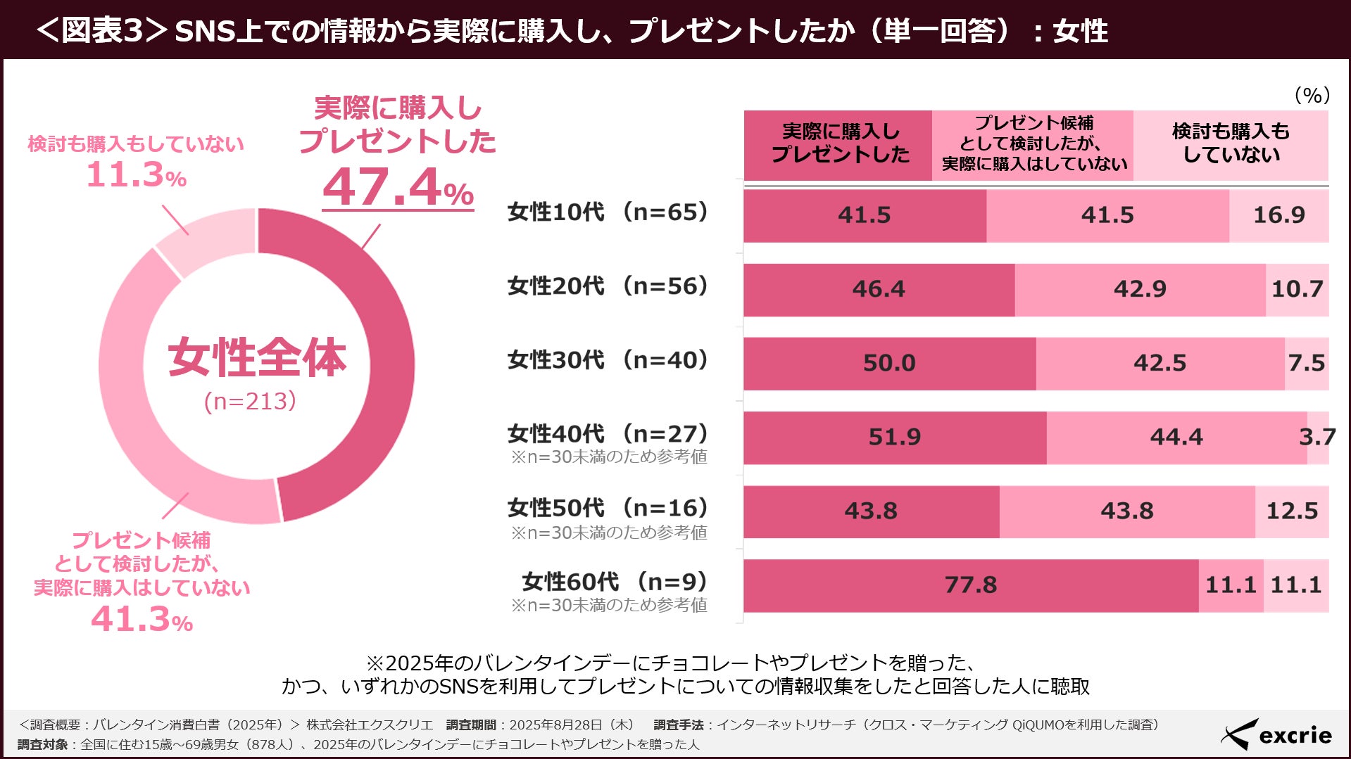 また、SNSを利用してバレンタインについて情報収集をした人のうち、約半数がSNSで見た商品などを実際に購入し、プレゼントしたと回答しました。(図表3)