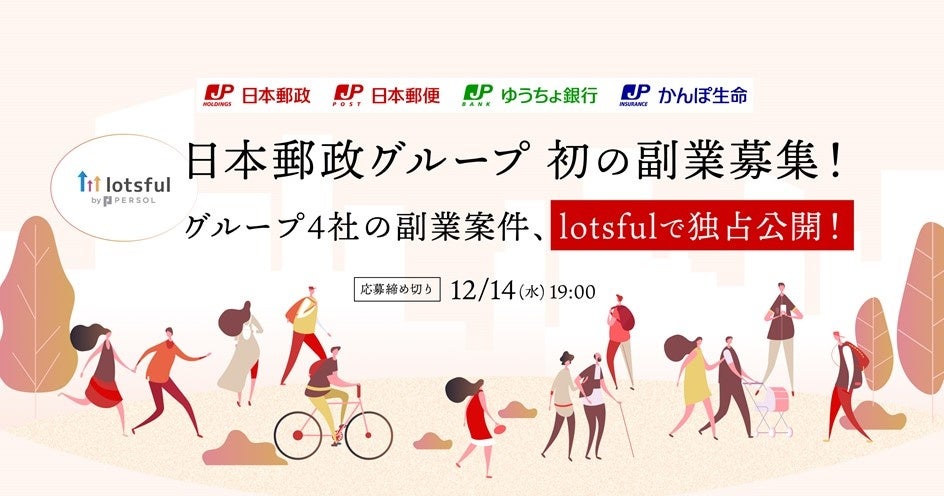 総合人材サービス、パーソルグループのパーソルイノベーション株式会社(本社:東京都港区、代表取締役社長:長井 利仁)が運営する副業人材マッチングサービス『lotsful(ロッツフル)』(https://lotsful.jp/)は、日本郵政グループが発表する“戦略的副業”の試行開始に伴い、副業人材の募集(https://lotsful.jp/specials/japanpost)を本日より開始します。日本郵政グループでの副業人材の募集は初となり、『lotsful』独占での取り組みとなります。また、今回は、外部人材登用のためのみならず日本郵政グループ社員が社外で副業をする際にも活用頂くことになりました。