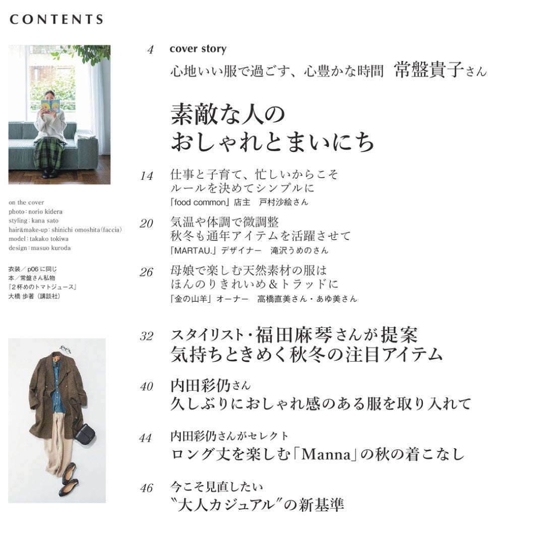 包みこまれるような、やわらかなニット。ほんのり光沢のあるふんわりとしたワンピース。 好きなことをして過ごす、とっておきの時間をさらに心地よいものにしてくれるデイリーウェアたち。 本誌初登場の常盤貴子さんの素敵な着こなしと “普段着での時間” についてのお話をご紹介しています。常盤さんの私物も掲載、必見です!