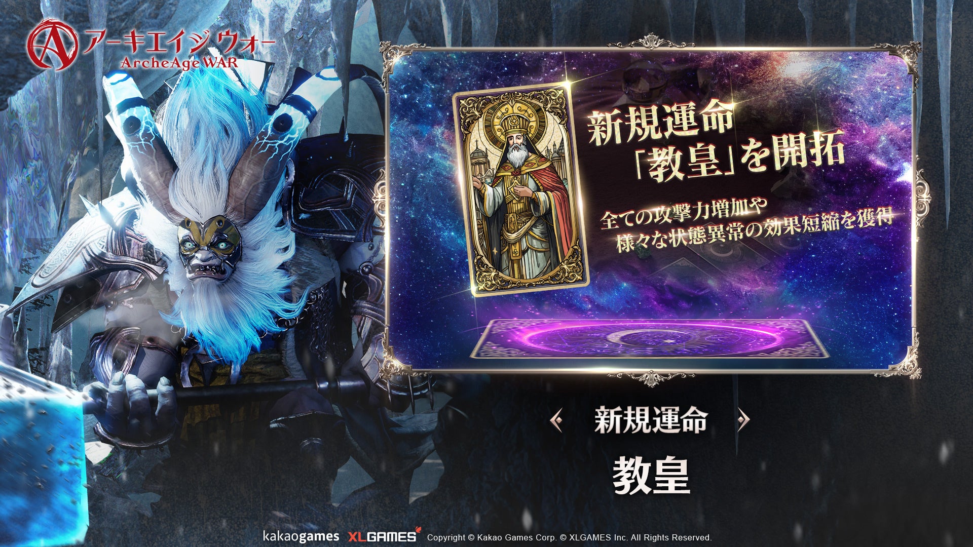今回のアップデートでは新規運命「教皇」が追加される。「教皇」では「全ての攻撃力増加」や「様々な状態異常の効果短縮」などの効果が獲得できる。