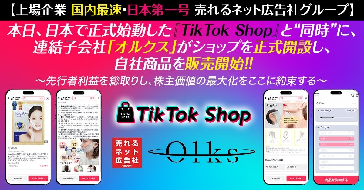 【上場企業 国内最速・日本第一号 売れるネット広告社グループ】本日、日本で正式始動した『TikTok Shop』と“同時”に、連結子会社「オルクス」がショップを正式開設し、自社商品を販売開始!!~先行者利益を総取りし、株主価値の最大化をここに約束する~