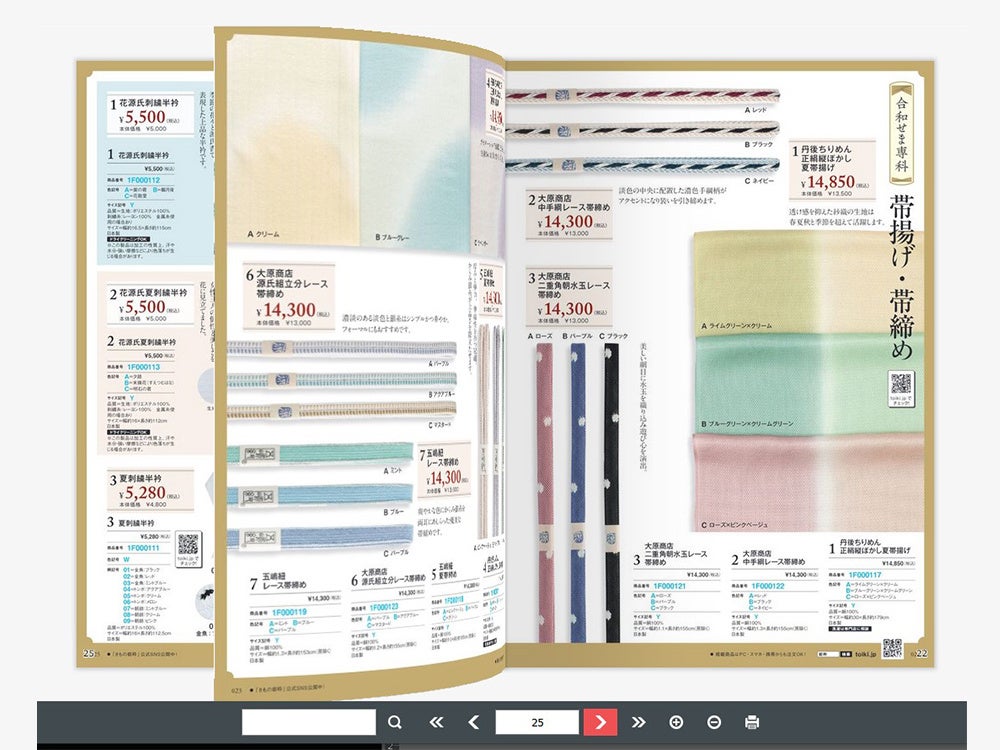 PC、タブレット、スマートフォンのいずれでも、冊子と同様な操作ですぐに閲覧できる電子カタログが公開!色柄の拡大や、QRコードからの購入が可能に。