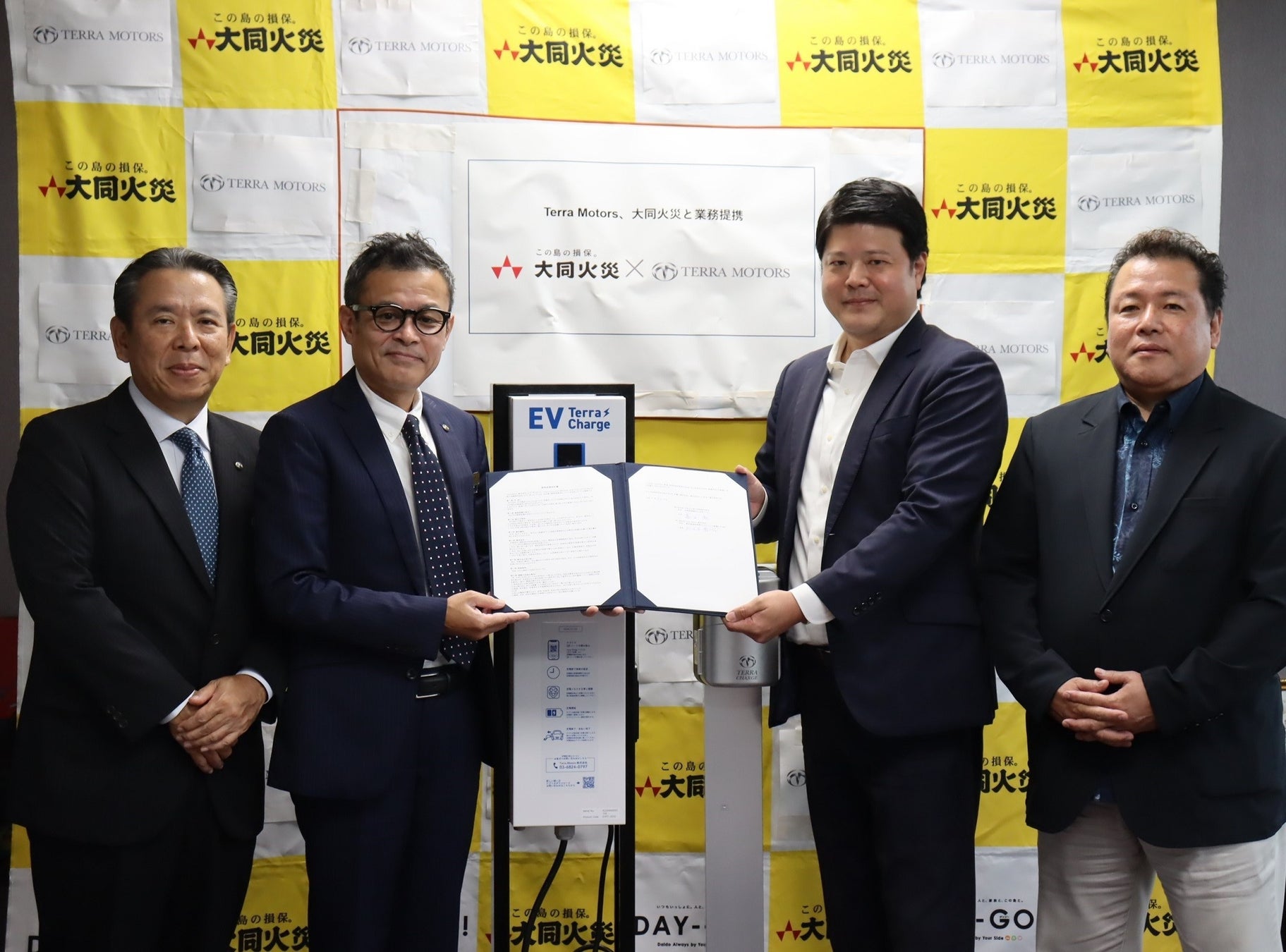 EV充電インフラ事業「Terra Charge(読み:テラチャージ)」を展開するTerra Motors株式会社(本社:東京都港区、取締役会長:徳重徹 / 代表取締役社長:上田晃裕、以下「テラモーターズ」)は、沖縄県の損害保険シェアNo.1*の大同火災海上保険株式会社(本社:沖縄県那覇市、取締役社長:与儀達樹、以下「大同火災」)と、業務提携契約を締結いたしました。沖縄県内のEV充電インフラ普及を加速させ、安心安全なサービス体制・脱炭素社会への貢献など持続可能な社会構築を相互に目指してまいります。* 沖縄県で損害保険を販売している損害保険会社の保険料収入より(大同火災調べ/2022 年度)