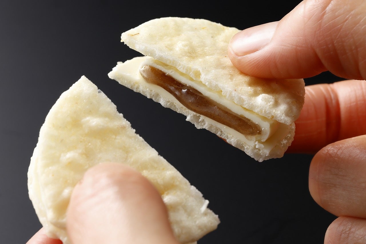 「あんとろべい」は、富山湾の宝石と称されるしろえびを練り込んだおせんべいで、北海道産小豆を使用したとろりあんこを挟んだ新感覚の米菓です。 伝統と革新が織りなすこれまでにない味わいが、多くのお客様にご好評いただいております。