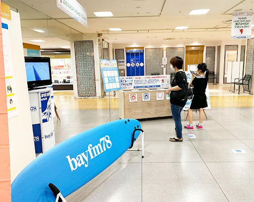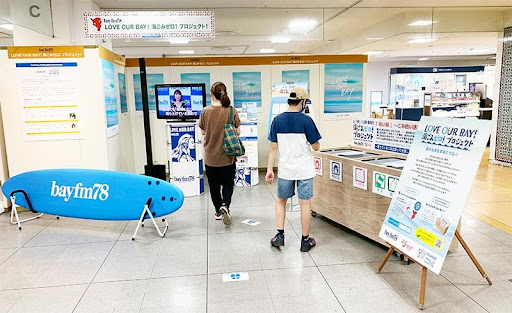 bayfmブースとしてステーションメッセージの「LOVE OUR BAY」を打ち出し、国連のSDGメディアコンパクト加盟や気象会社ウェザーニューズとの連携など、環境に関する取り組みをパネル展示しつつ、今回のCHANGE FOR THE BLUEの一環として展開する「LOVE OUR BAY! 海ごみゼロ! プロジェクト」の紹介と、これから県内各地に設置予定の「拾い箱(ごみ拾い専用ごみ回収箱)」の展示、「海ごみ検定」のパネル展示を行いました。