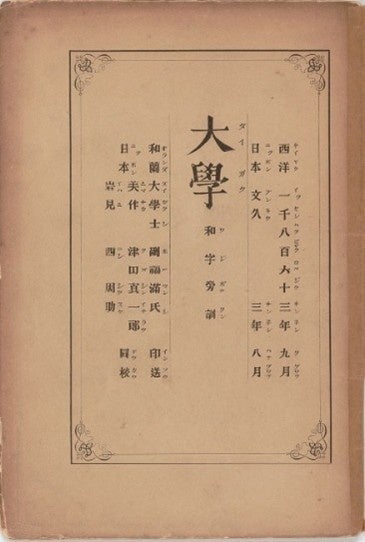 本書はライデン大学日本学教授ホフマンが文久2年(1862)にオランダに留学した幕府洋書調所教官の津田真一郎(のち真道・まみち)と西周助(のち周・あまね)の協力を得て、日本の『大学 朱熹章句』訓点本(版種不明)をオランダ植民省の漢字仮名活字を用いて翻刻刊行した漢文教科書である。