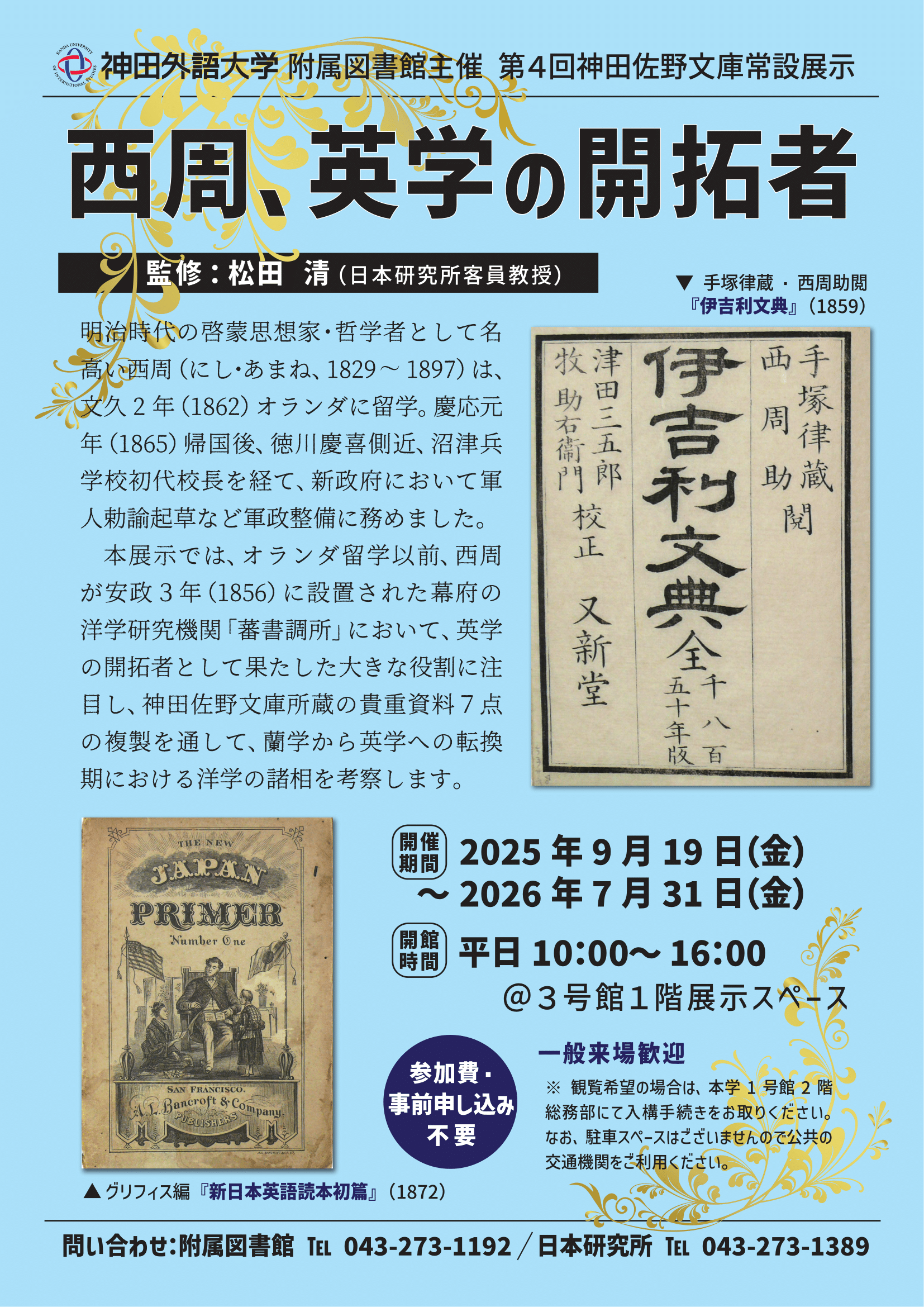 神田外語大学(千葉市美浜区/学長:宮内孝久)附属図書館では、現在、第4回神田佐野文庫常設展示「西周、英学の開拓者」を開催中です。これまでの第1回「諳厄利亜(あんげりあ)語、エゲレス語、エンケレセ―『英語』になるまで―」、第2回「大黒屋光太夫のロシア文字『福寿』」、第3回「終戦後の英語ブーム」に続き、今回は幕末から明治にかけて活躍した啓蒙思想家・西周(1829–1897)が幕府の洋学研究機関「蕃書調所」で英語文献の翻訳に従事したことに注目し、蘭学から英学へと移り変わる時代の姿を、神田佐野文庫所蔵の貴重資料9点の複製を通じてご覧いただけます。参観無料・事前申し込み不要です。
