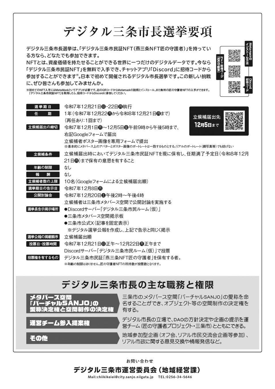 新潟県三条市のデジタル空間において、全国初となるデジタル市長を決める「デジタル三条市長選挙」を開催します。