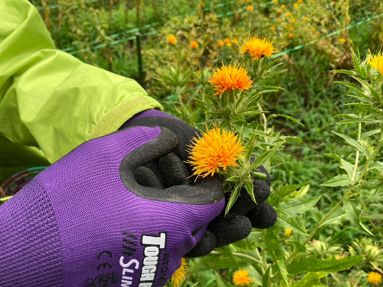 白鷹町は紅花の生産量が日本一で、町内の450アールほどの畑で栽培され、7月には紅花の収穫が最盛期を迎えます。暑さやトゲの痛さも忘れて、ひたすら紅花を摘む光景は、まさにしらたかの夏の風物詩。
