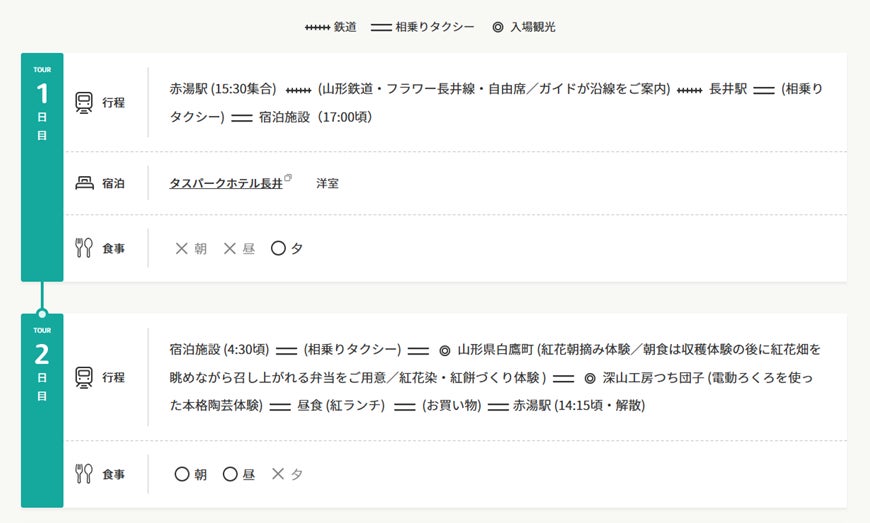 山形県白鷹町・早朝紅花摘み体験ツアーと山形県小国町・森林セラピー体験ツアーの2コースをご用意