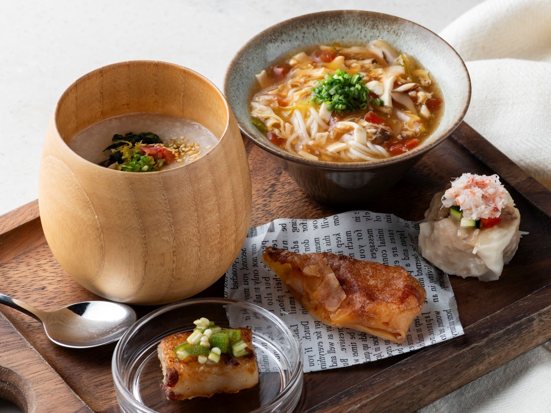あっさりとした朝粥に七菜をトッピング。海老チリとモッツァレラチーズが入った春巻きと、季節の焼売も。出汁の旨味がしっかりと効いた酸辣湯は、さっぱりとした味わいで食欲を刺激し、胃を優しく目覚めさせてくれます。食欲がない日にもおすすめ。