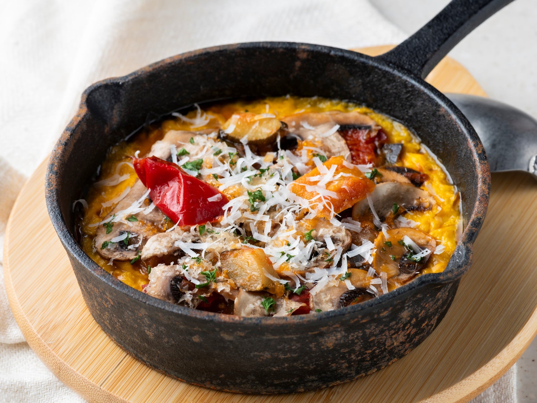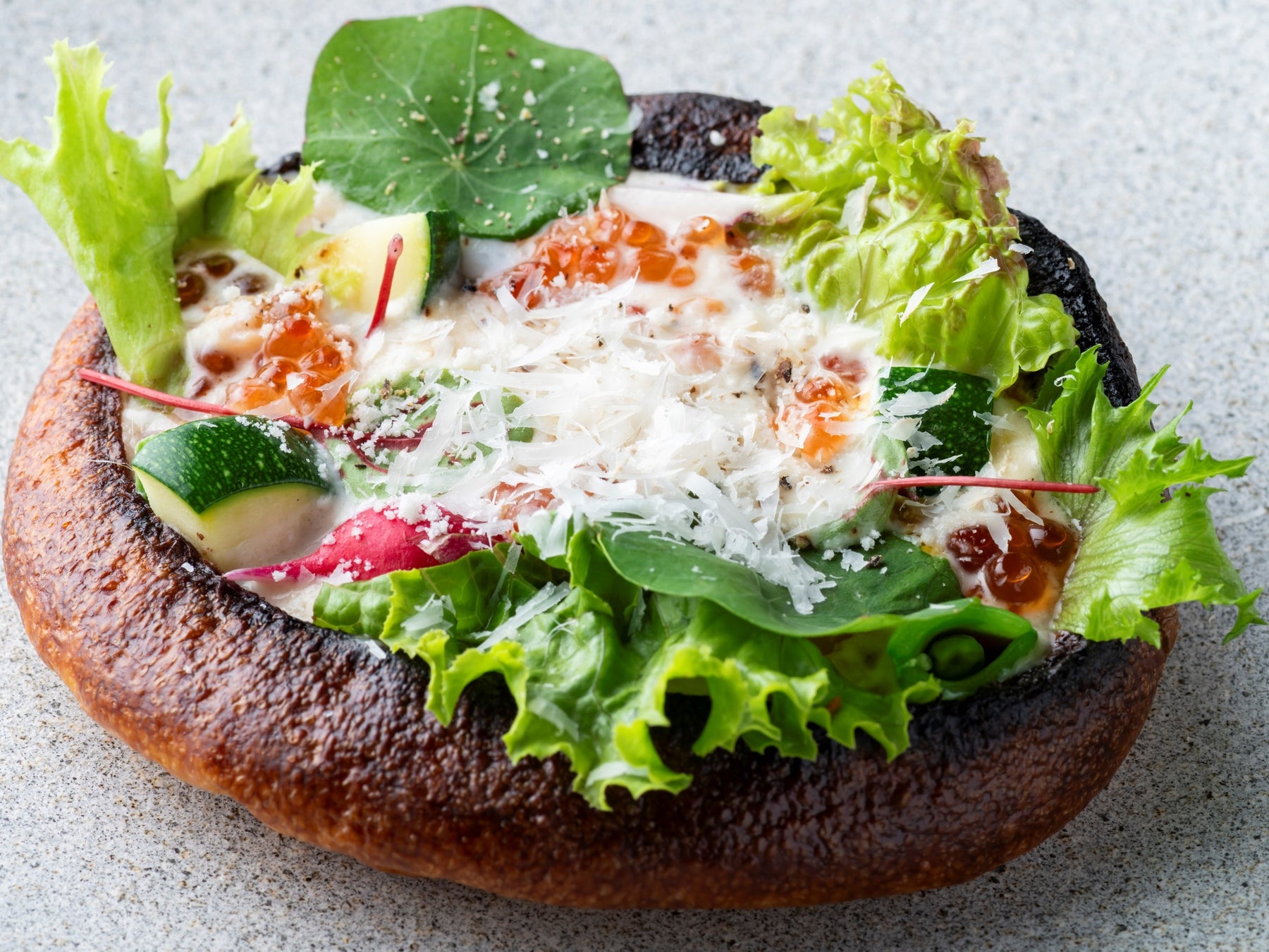 白いんげんとにんじんがベースの植物性たまご「プラントベースエッグ」を使用し、たっぷりとキノコと季節野菜の煮込みを合わせた食べ応えもあり、ヘルシーなベジタリアン料理。