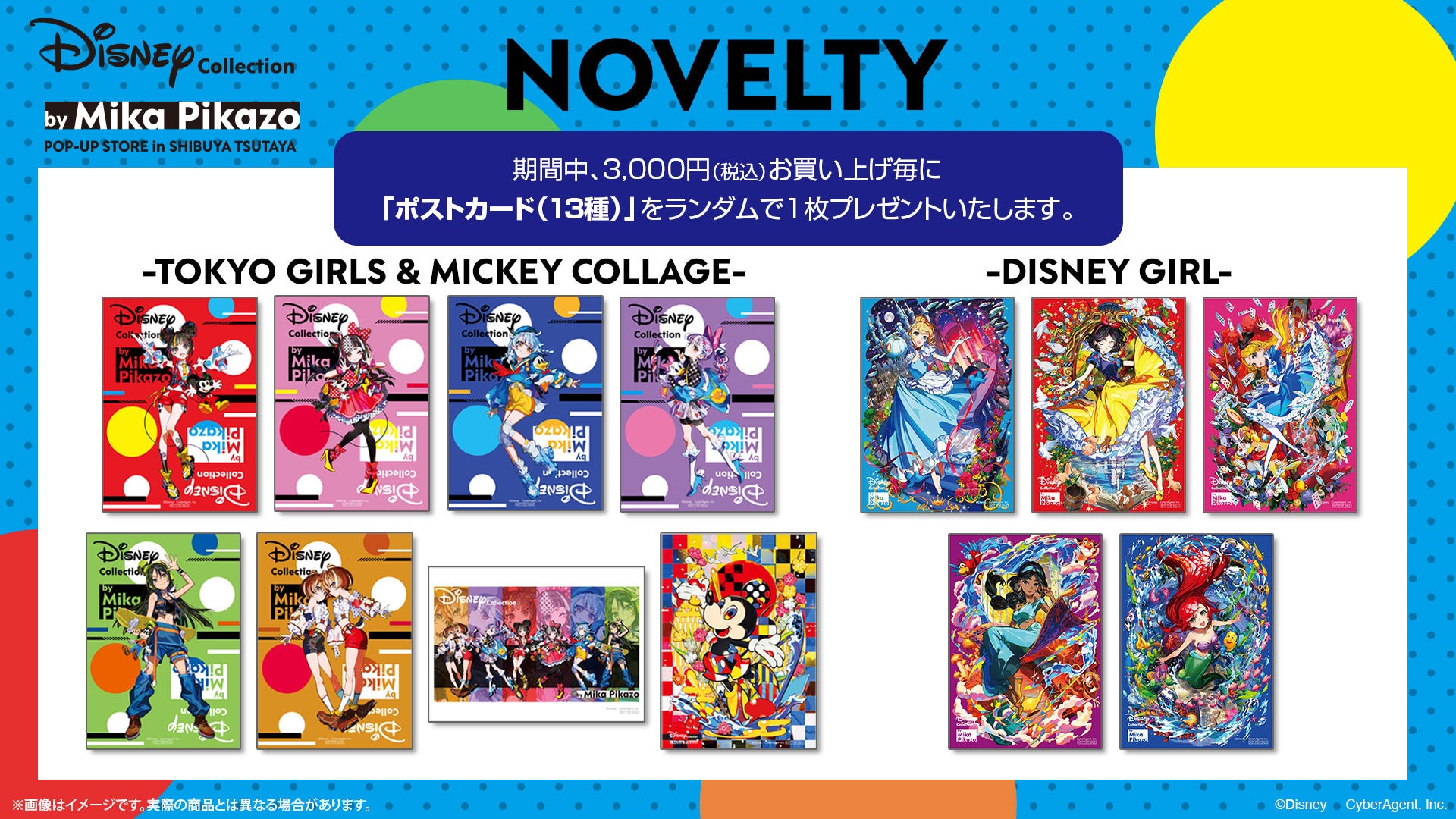 POP-UP STORE ・WEB受注販売共に、3,000円(税込)お買い上げいただく毎に「Disney Collection by Mika Pikazo」のアートが描かれたポストカード全13種のうちランダムで1枚をプレゼントいたします。