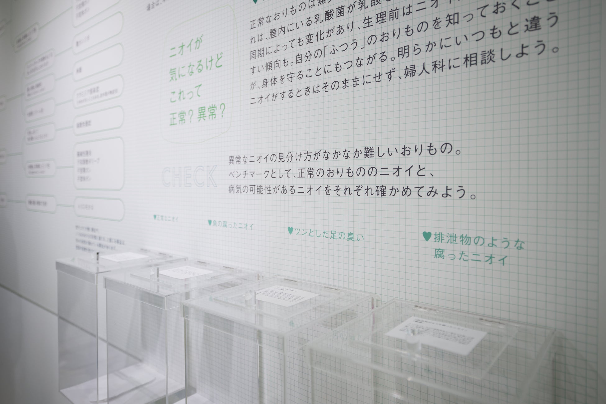 「生理」については、学校教育でも教えられ、オープンに語れるムードが徐々に生まれてきた一方で、生理以上に身近な現象である「おりもの」についての悩みや、正しいケアの方法などが語られることは、いまだほとんどありません。そうした課題感を踏まえて会場では、おりものと生理、おりものとSEX、おりものとニオイ、おりものとケア、など、おりものにまつわる疑問をジャンル別に展示。小林製薬の研究所で使用している、おりもののニオイや色、形状のサンプルも展示しました。