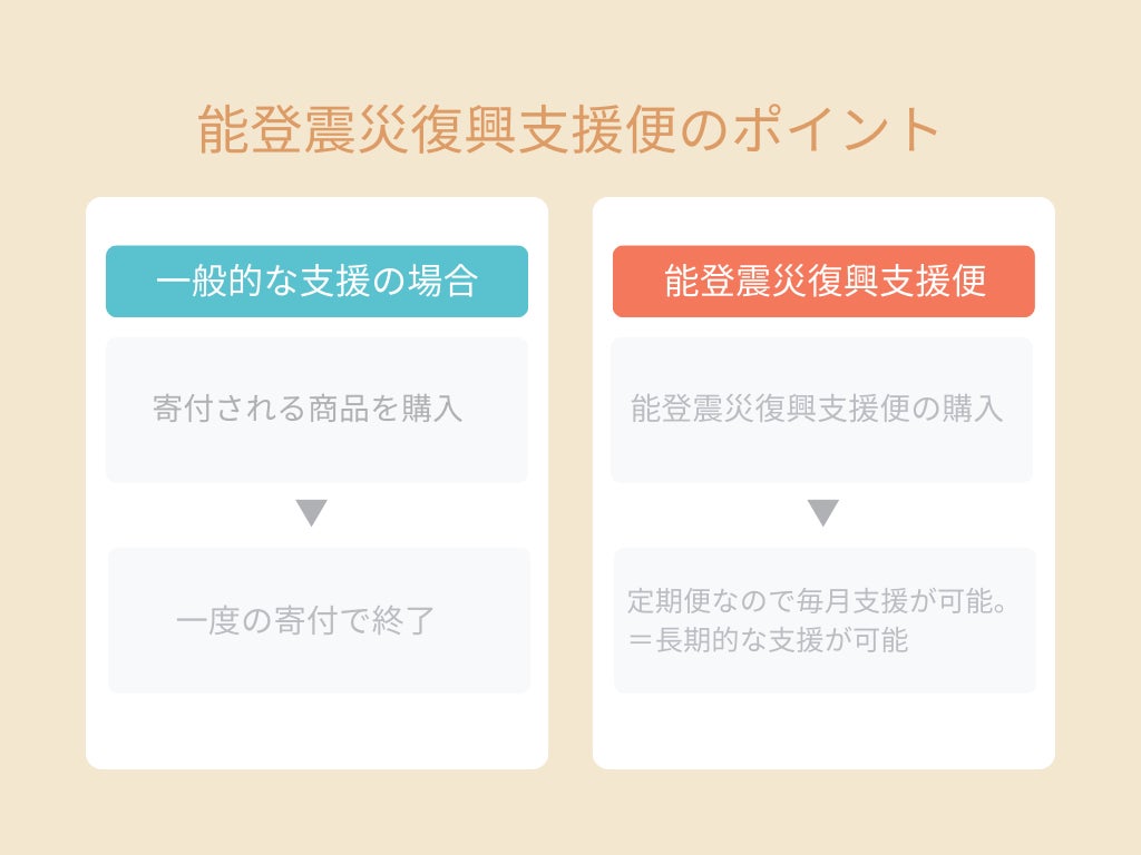 そのため、短期的な支援では一時的な支援に止まってしまい、雇用継続も困難となりますが、復興支援便は定期購入となるため、長期的に毎月支援を行うことが可能になります。