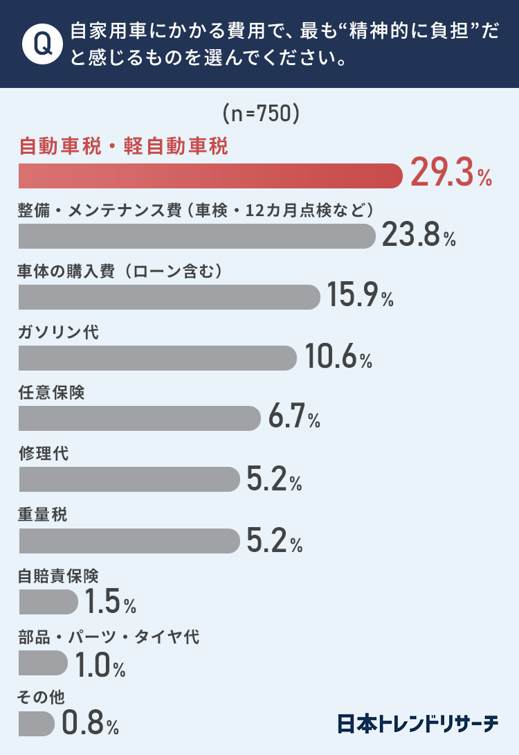 車を所有している方の29.3%が、車にかかる費用で「自動車税・軽自動車税」が最も“精神的に負担”
