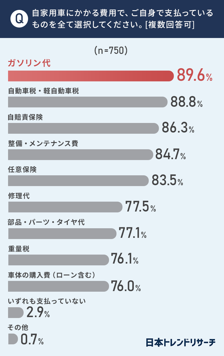 今回のアンケートでは「いずれも支払っていない」方は2.9%で、9割以上の方が何らかの自家用車にかかる費用を支払っていると回答しました。