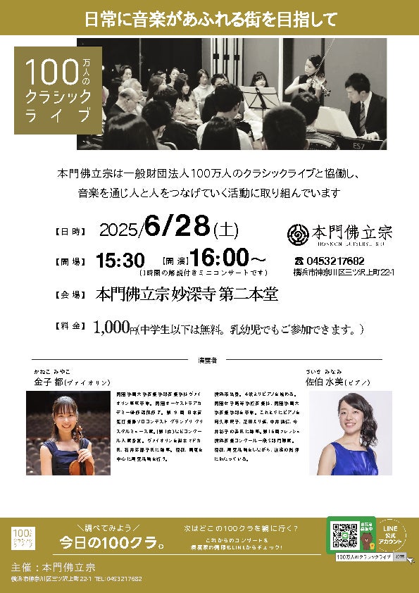 製造、建設、不動産、医療・ヘルスケア、物流、ITに特化したM&A仲介を⾏う株式会社M&Aベストパートナーズ(本社:東京都千代田区、代表取締役社長:齋藤 達雄 以下M&Aベストパートナーズ)と、一般財団法人100万人のクラシックライブ(東京都千代田区、代表理事:蓑田秀策 以下100万人のクラシックライブ)は、6月28日(土)16:00より、本門佛立宗 妙深寺にて、クラシックライブを開催することをお知らせいたします。