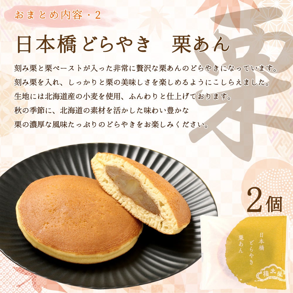 秋の季節に栗の濃厚な風味たっぷりのどらやきをお楽しみください。